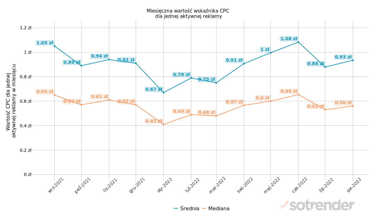 W lipcowych Facebook Trends pisaliśmy o spadku średnich kosztów reklamowych – zarówno w przypadku CPC, jak i CPM. W sierpniu, średni koszt kliknięcia w reklamę wzrósł o 5 gr, i wyniósł 93 gr. Mediana średniego CPC wyniosła 56 gr, czyli o 3 gr więcej w stosunku do lipca.