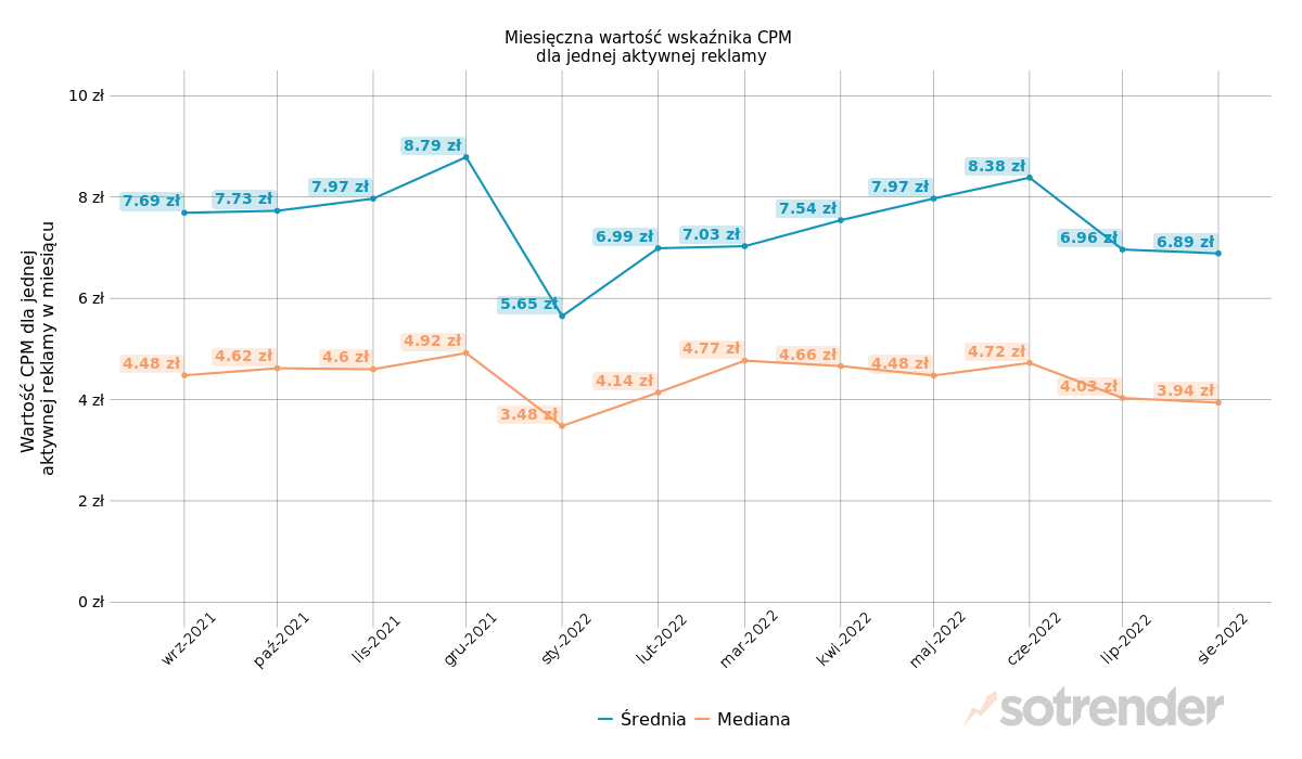 A jak zmienił się średni koszt tysiąca wyświetleń? Średni CPM był w sierpniu o 7 gr mniejszy niż w lipcu, i wyniósł 6 zł 89 gr. Mediana średniego CPM przyjęła w sierpniu wartość 3 zł 94 gr. W lipcu było to 4 zł 3 gr, czyli o 9 gr więcej.