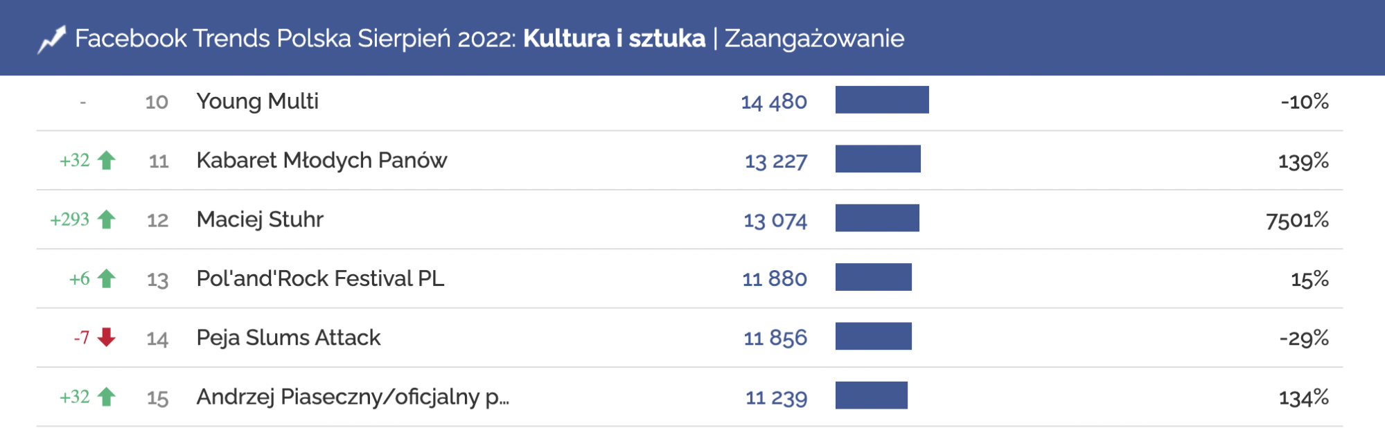 Profile o największym zaangażowaniu użytkowników, Kultura i sztuka | Facebook, sierpień 2022