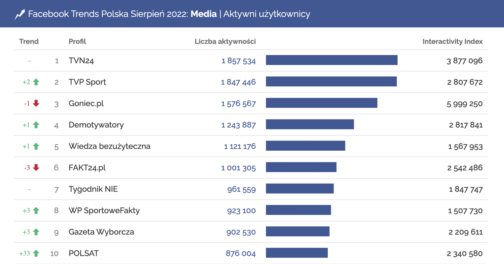 Profile o największej aktywności użytkowników, Media | Facebook, sierpień 2022