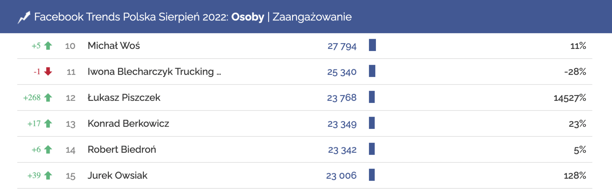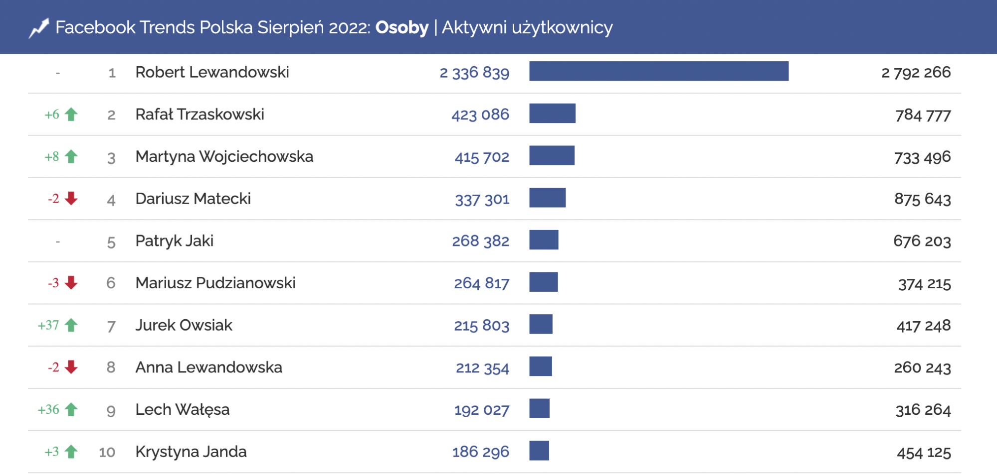 Profile o największym zaangażowaniu użytkowników, Osoby | Facebook, sierpień 2022