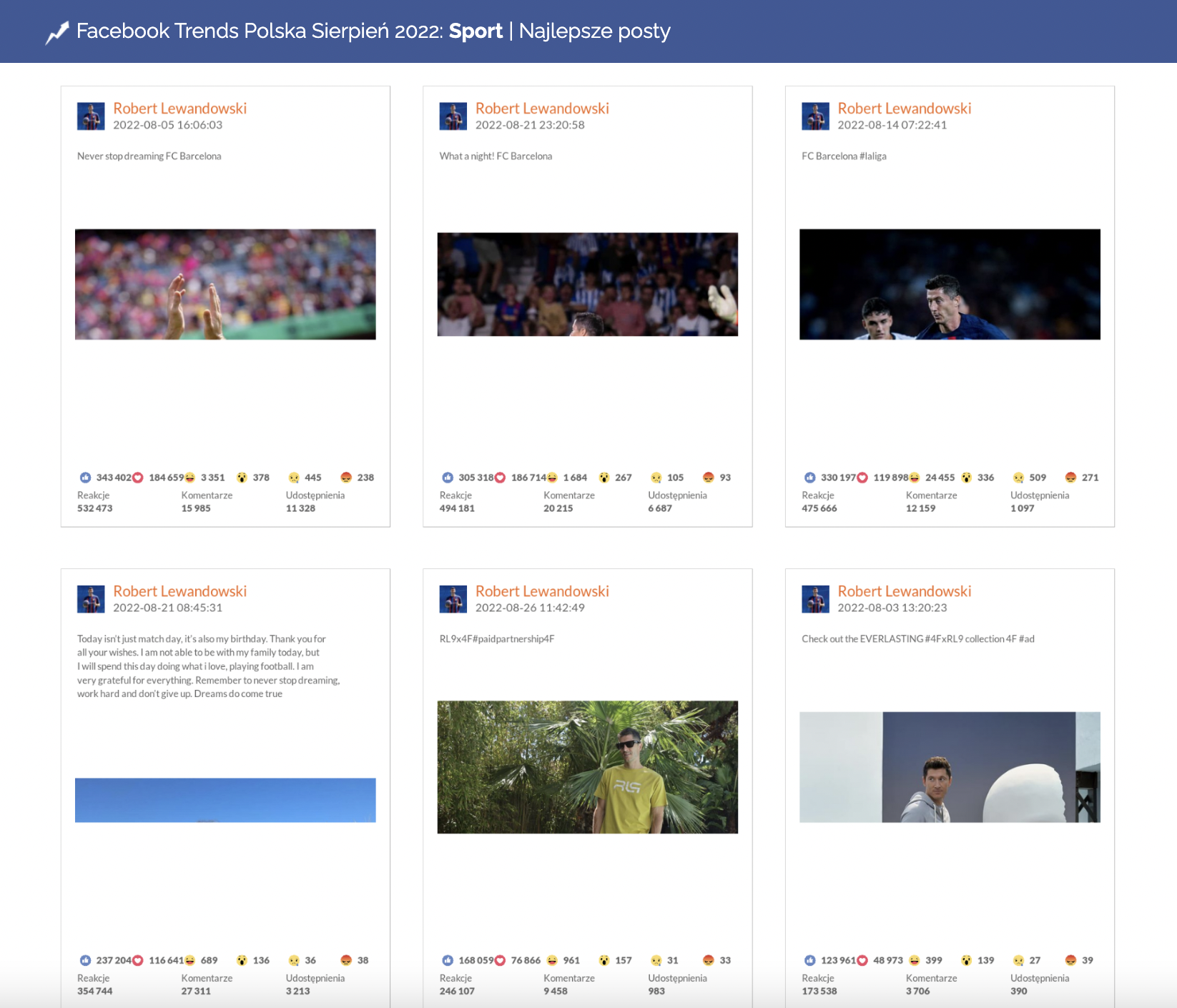 Robert Lewandowski co miesiąc zajmuje wysokie pozycje w naszych raportach Facebook Trends. A po niedawnym transferze piłkarza do katalońskiego klubu FC Barcelona, o Lewandowskim mówi się na Facebooku jeszcze więcej. W sierpniu, trzy najlepsze posty w kategorii Polskojęzyczne należały właśnie do Lewandowskiego. Również w kategorii Sport, aż 6 najlepszych postów dotyczyło najpopularniejszego polskiego piłkarza.
