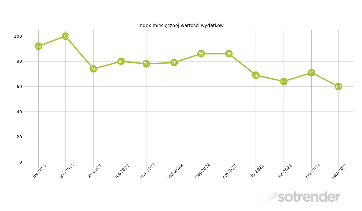 Jak czytać wykres? Wartość 100 oznacza najwyższą wartość wydatków na przestrzeni roku. Wartość 50 oznacza, że wysokość wydatków w danym miesiącu była dwukrotnie mniejsza.