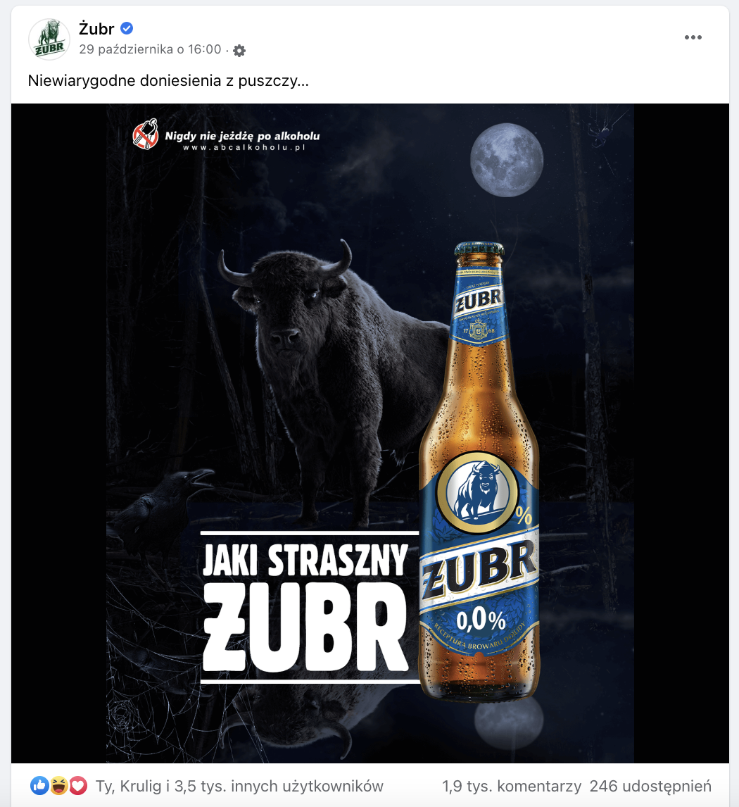 Na profilu marki pojawiła się grafika, nawiązująca ponownie do Halloween, sugerująca, że pojawi się Żubr 0%. Informacja, która wstrząsnęła częścią facebookowiczów, okazała być się pułapką zastawioną przez Żubra, halloweenową grą. Kto uważnie czytał komentarze pod postem mógł dopatrzeć się odpowiedzi moderatorów, które wszystko wyjaśniały – Żubr widzi, że nabrał Cię na psikusa, czytamy.