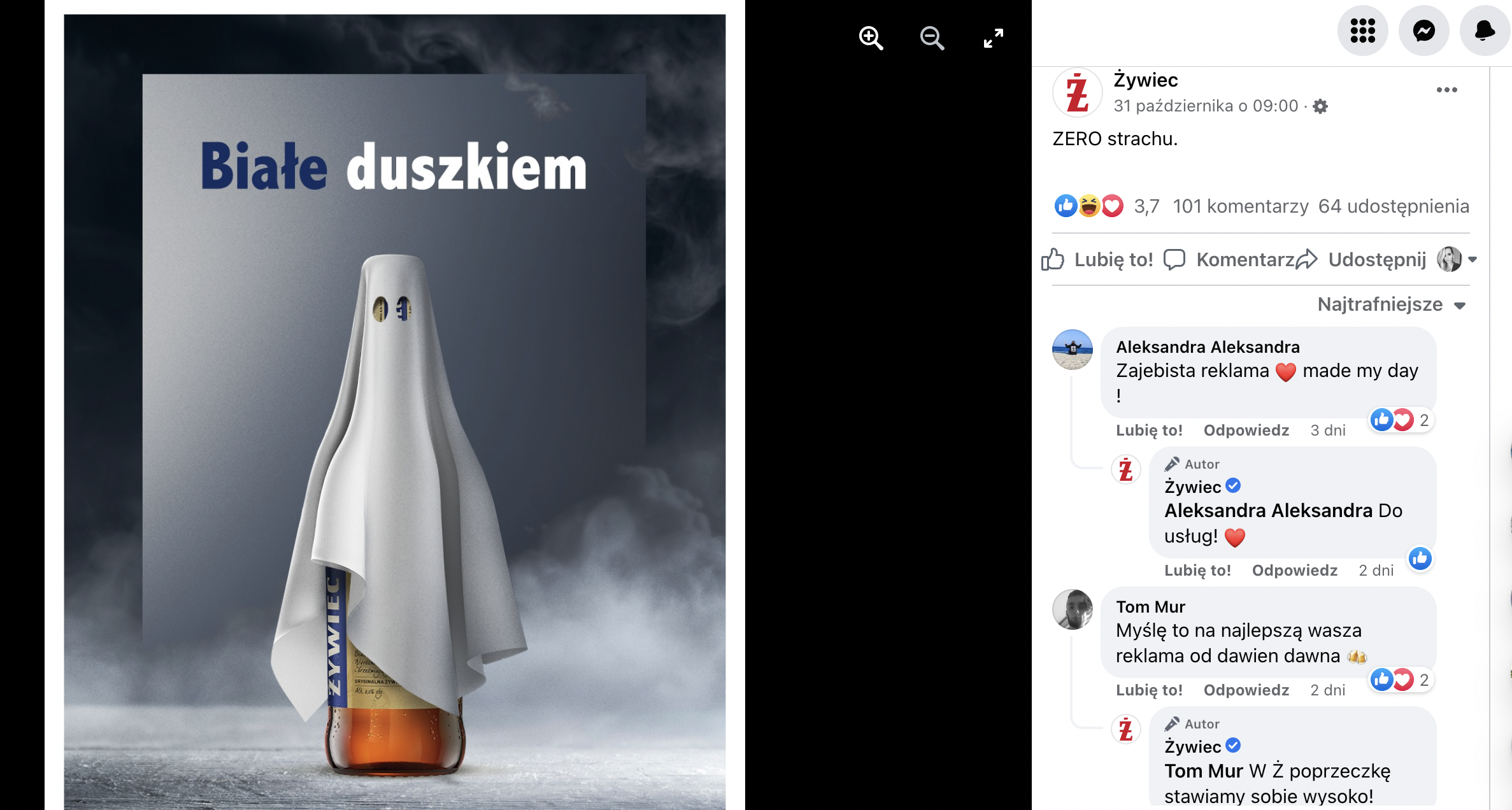 Kreacja Żywca, która w błyskotliwy i zarazem minimalistyczny sposób nawiązywała do Halloween, spotkała się z bardzo pozytywnym odbiorem. Genialne, Szacun za hasło marketingowe czytamy pod postem.