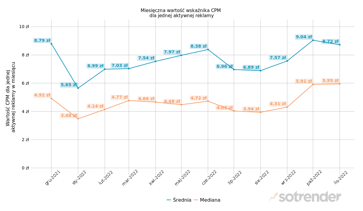 Podsumowując listopad nie możemy nie przyjrzeć się temu, jak kształtowały się ceny reklam na Facebooku. Co nieco zaskakujące, za CPC i CPM, mimo Black Friday, w ogólnym rozrachunku marketerzy nie płacili dużo więcej niż miesiąc temu – średni koszt CPM spadł o 32 grosze.