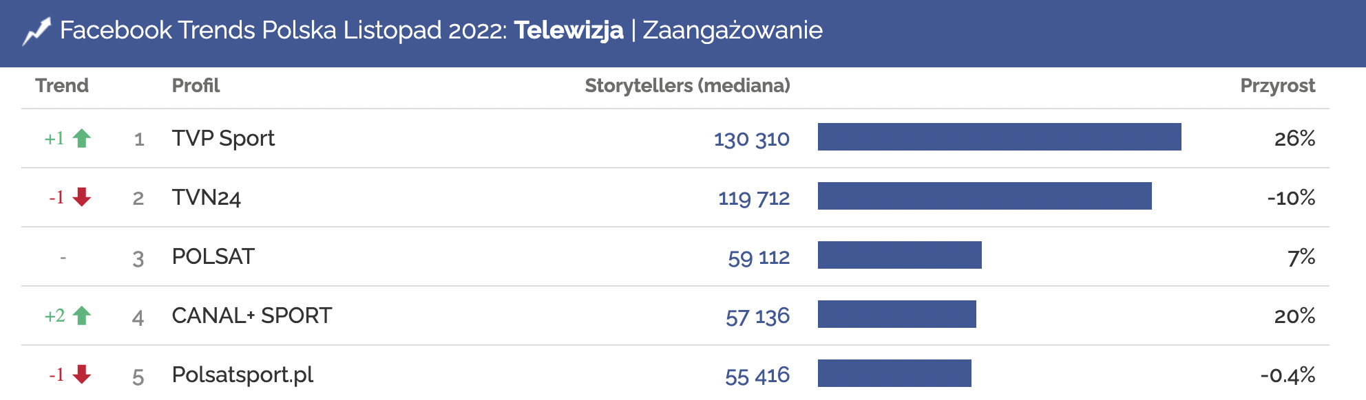 Dzięki temu, profilowi TVP Sport udało się wyprzedzić profil TVN24, zarówno w zestawieniu Zaangażowania, jak i Aktywnych użytkowników, w kategorii Telewizja.