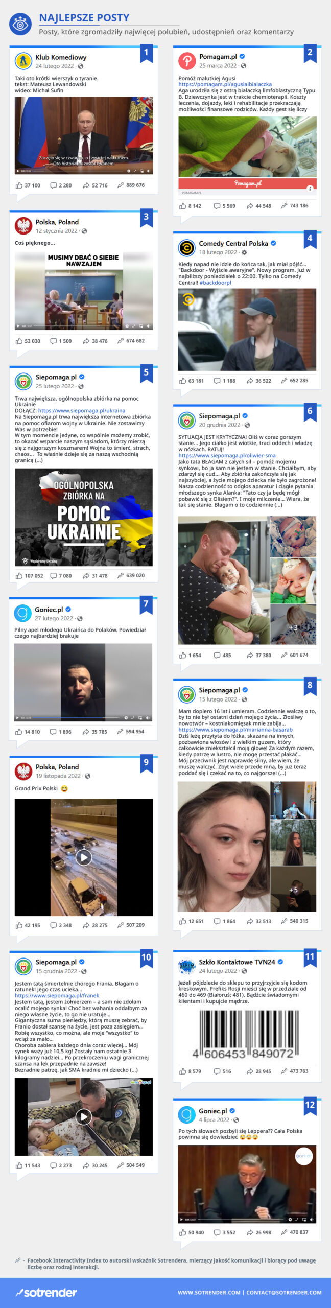 Najlepszym postem roku, który był bezpośrednim odwołaniem do wydarzeń w Ukrainie, był lutowy post Klubu Komediowego. Wojna w Ukrainie była niewątpliwie jednym z ważniejszych wydarzeń minionego roku – co ma odzwierciedlenie w postach, które najbardziej angażowały facebookowiczów. Silnie angażujące były także posty ze zbiórkami na rzecz potrzebujących – 4 z 12 najlepszych postów roku należało do profilu Siepomaga.pl. Niespodzianką jest numer 4. w naszym zestawieniu. Tuż za podium znalazł się bowiem post Comedy Central Polska, który był satyryczną zapowiedzią nowego programu “Backdoor – Wyjście awaryjne” i zdobył imponującą aktywność użytkowników.