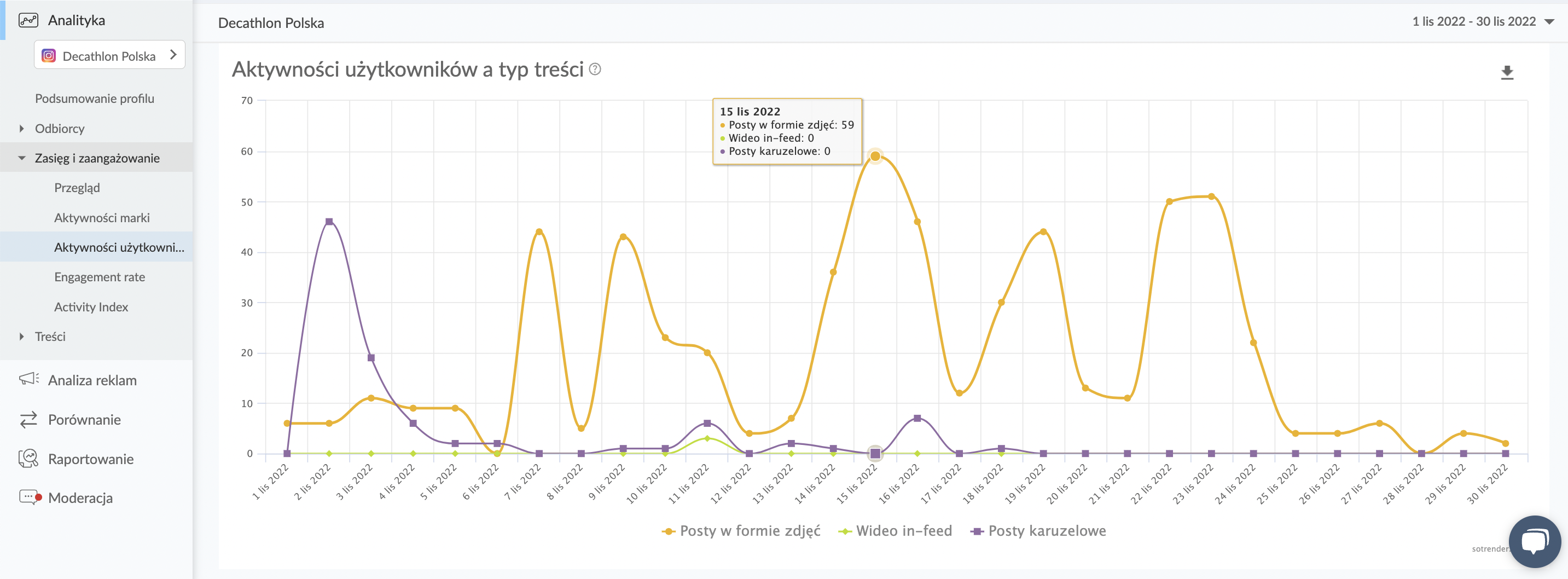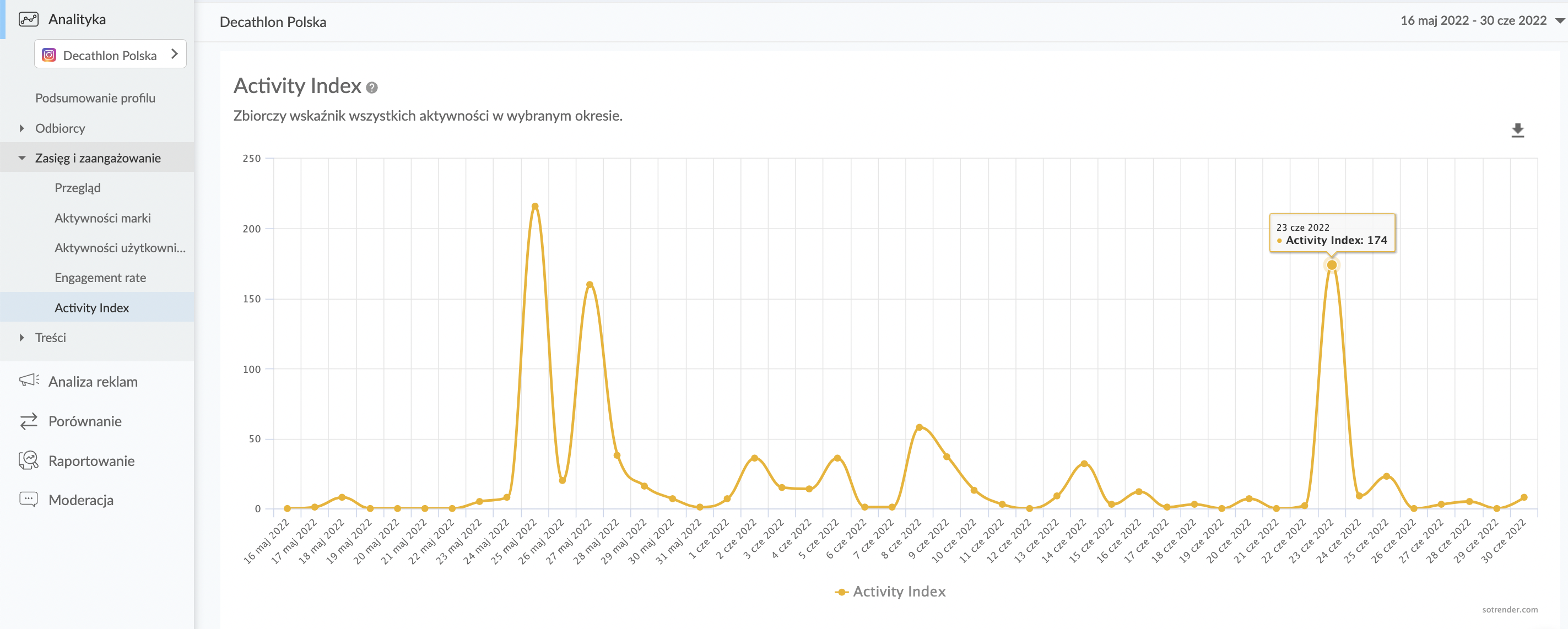 Obecnie, osoby odpowiedzialne za social media w Decathlonie, w głównej mierze korzystają z Sotrendera do analizy szeroko pojętego zaangażowania na Instagramie. Najczęściej analizowane są m.in. informacje odnośnie aktywności marki w przedziale czasowym w zestawieniu z aktywnością użytkowników. Monitorowane jest również to, jakie treści w danym tygodniu były najbardziej angażujące i jakich odbiorców przyciągały.