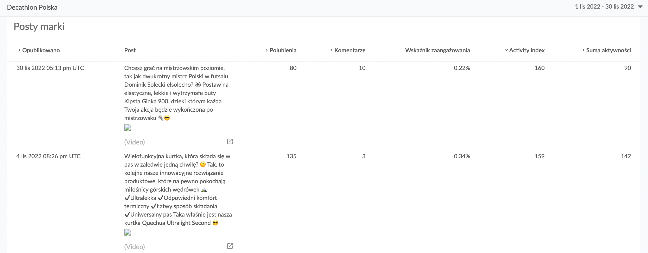 Jeśli chodzi o wskaźniki, najczęściej wykorzystywany jest Activity Index (i jego facebookowy odpowiednik Interactivity Index), który daje pogląd na całą aktywność użytkowników w wybranym okresie.