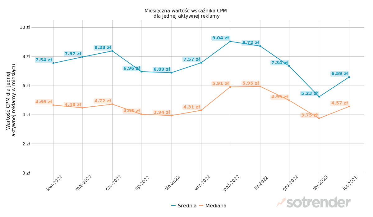 Pora na szybki update, jeśli chodzi o koszty reklamowe w ekosystemie Meta. Podczas gdy średni koszty CPC wyglądały niemalże identycznie, jak w styczniu (72 grosze w lutym, 70 groszy w styczniu), w minionym miesiącu odnotowaliśmy dość znaczny wzrost w koszcie dotarcia do tysiąca użytkowników.