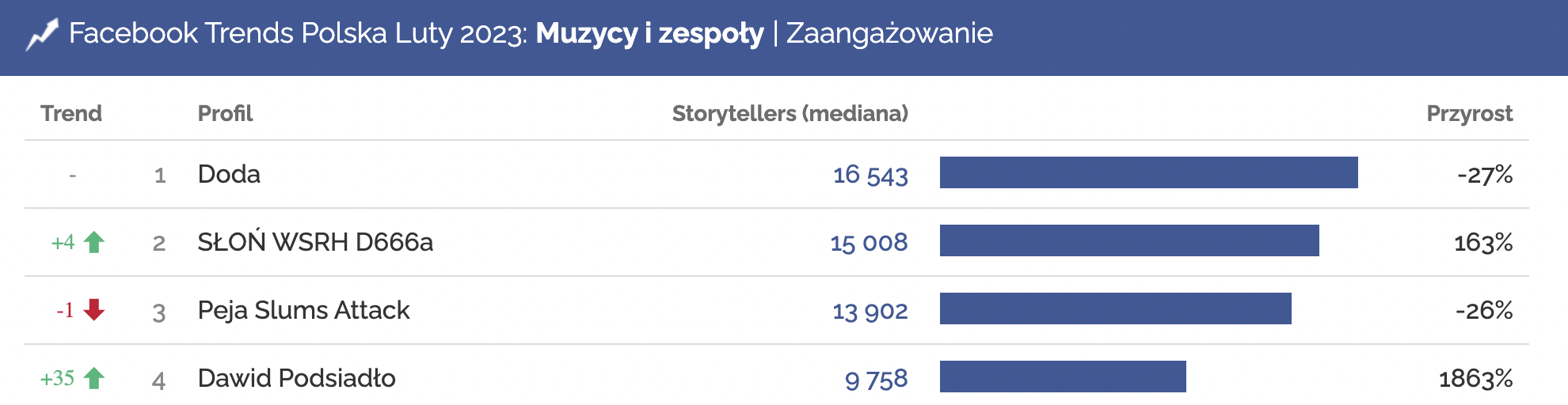 Profile w kategorii Muzycy i zespoły o największym zaangażowaniu w lutym 2023 na Facebooku