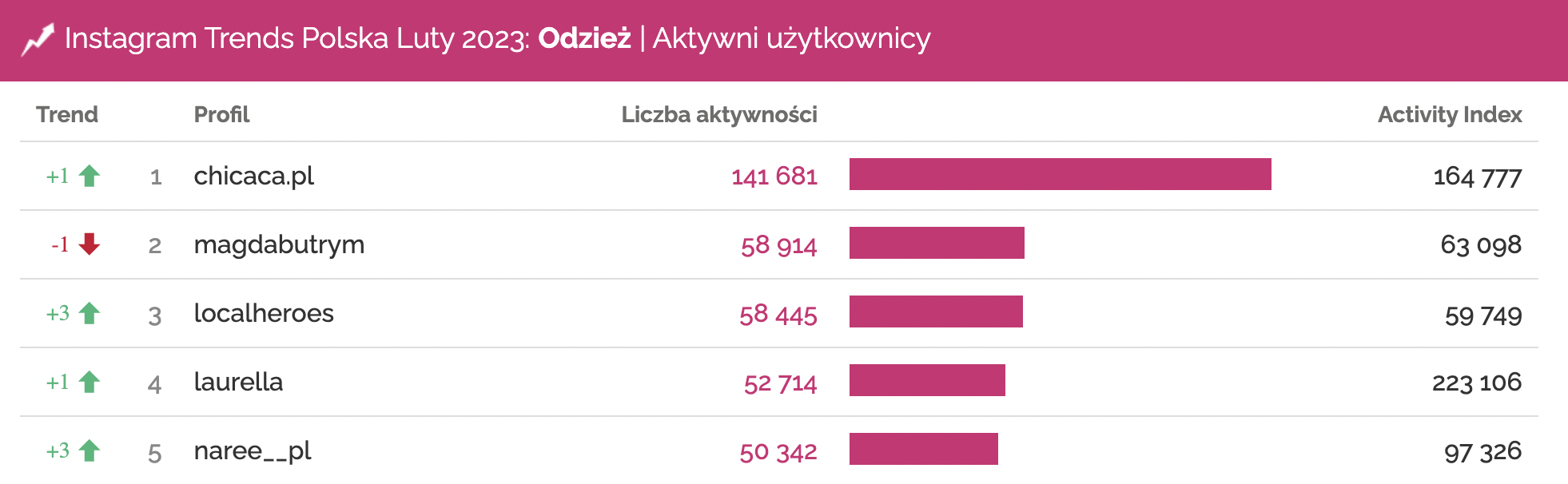 Profile o największej liczbie aktywności w kategorii Odzież | Instagram, luty 2023