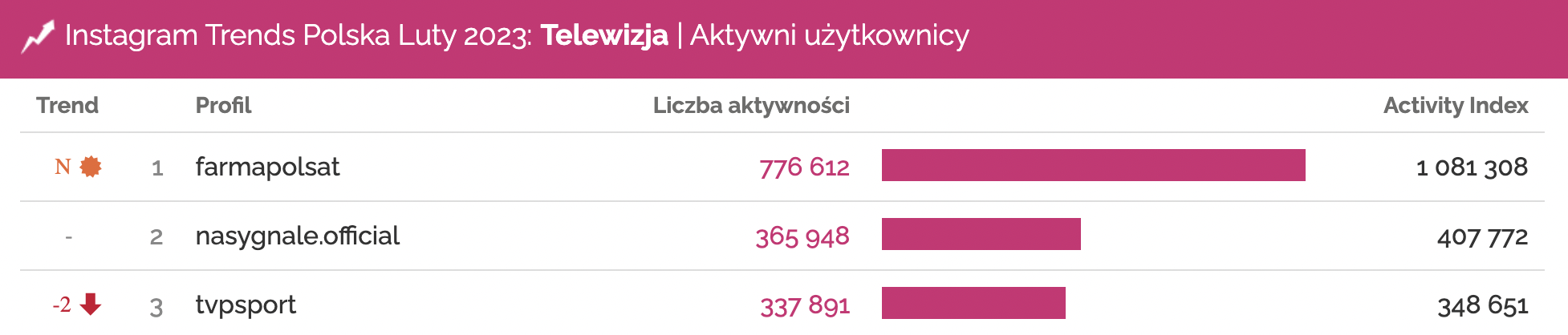 Profile o największej liczbie aktywności w kategorii Telewizja | Instagram, luty 2023