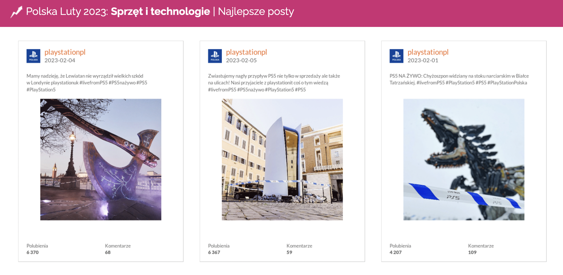Profil Playstation uplasował się na pozycji lidera pod kątem łącznej liczby aktywności w naszych Trendsach w kategorii Sprzęt i technologie. Co więcej, trzy najbardziej angażujące posty w tej kategorii należały właśnie do Playstation.