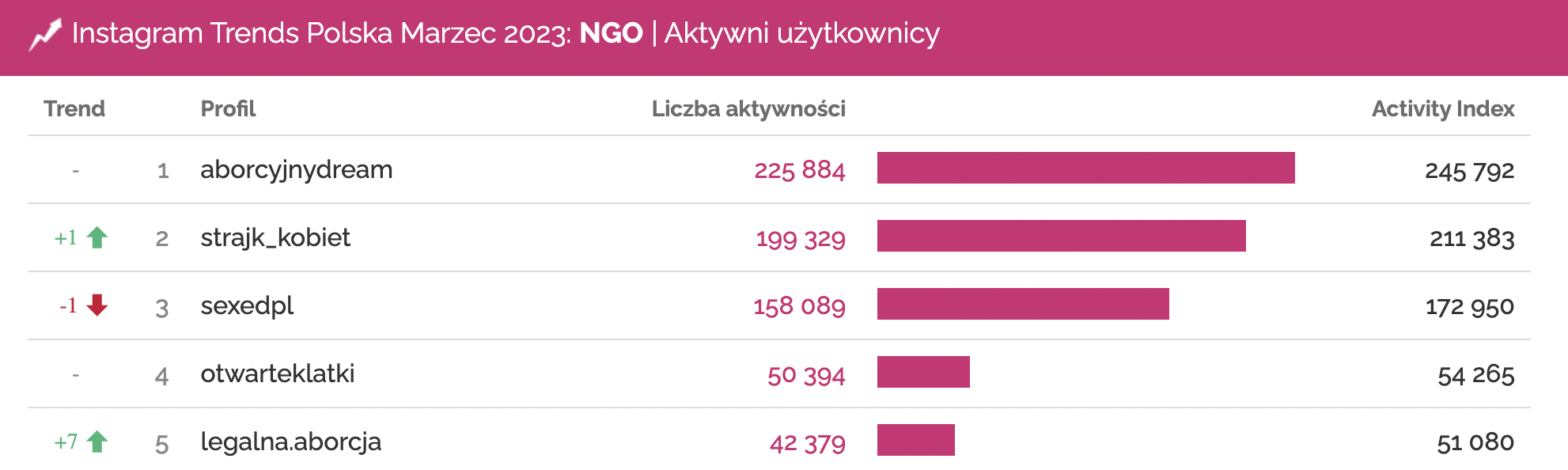 Profile w kategorii Organizacje NGO z największą liczbą aktywności użytkowników | Instagram, marzec 2023