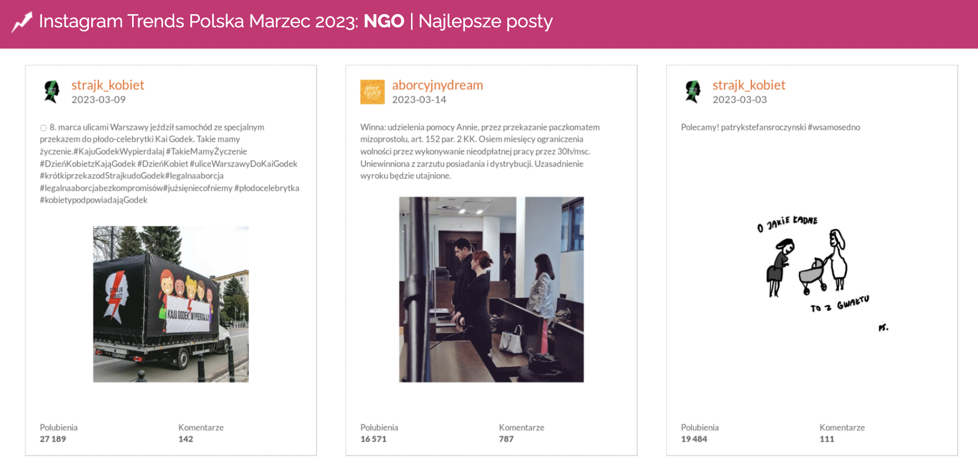 Najbardziej angażujące treści, dotykające tych zagadnień, opublikowano na profilu @strajk_kobiet oraz @aborcyjnydream. Jednocześnie były to dwa profile z największą łączną liczbą aktywności w całym miesiącu.