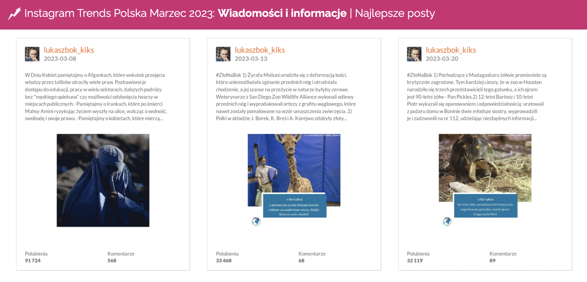 Tym razem, jego instagramowy cykl postów #ZłoNaBok, już trzeci miesiąc z rzędu totalnie zdominował kategorię Wiadomości i informacje. W marcu, cztery najlepsze posty miesiąca zostały opublikowane właśnie na profilu @lukaszbok_kiks.