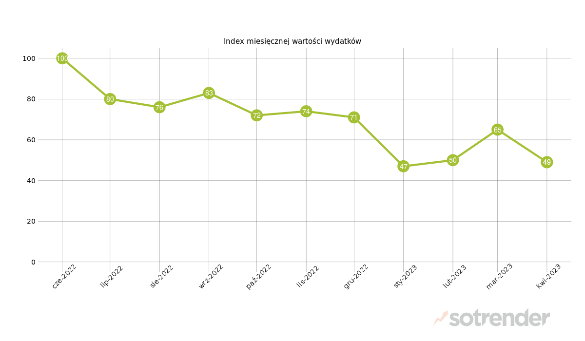 Jak czytać wykres? Wartość 100 oznacza najwyższą wartość wydatków na przestrzeni roku. Wartość 50 oznacza, że wysokość wydatków w danym miesiącu była dwukrotnie mniejsza.