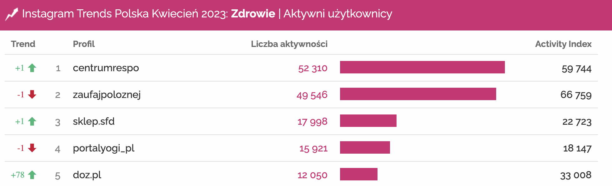Profile o największej liczbie aktywności użytkowników na Instagramie w kategorii Zdrowie | kwiecień 2023