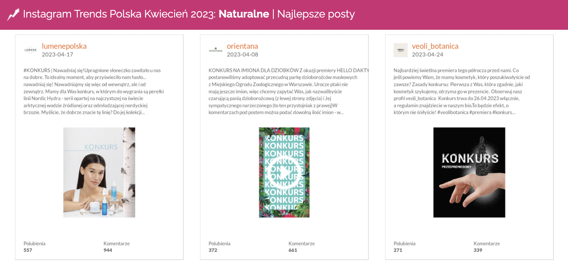 Również kategoria Kosmetyki naturalne została zdominowana przez konkursy – aż osiem najlepszych postów w tej kategorii było postami konkursowymi.