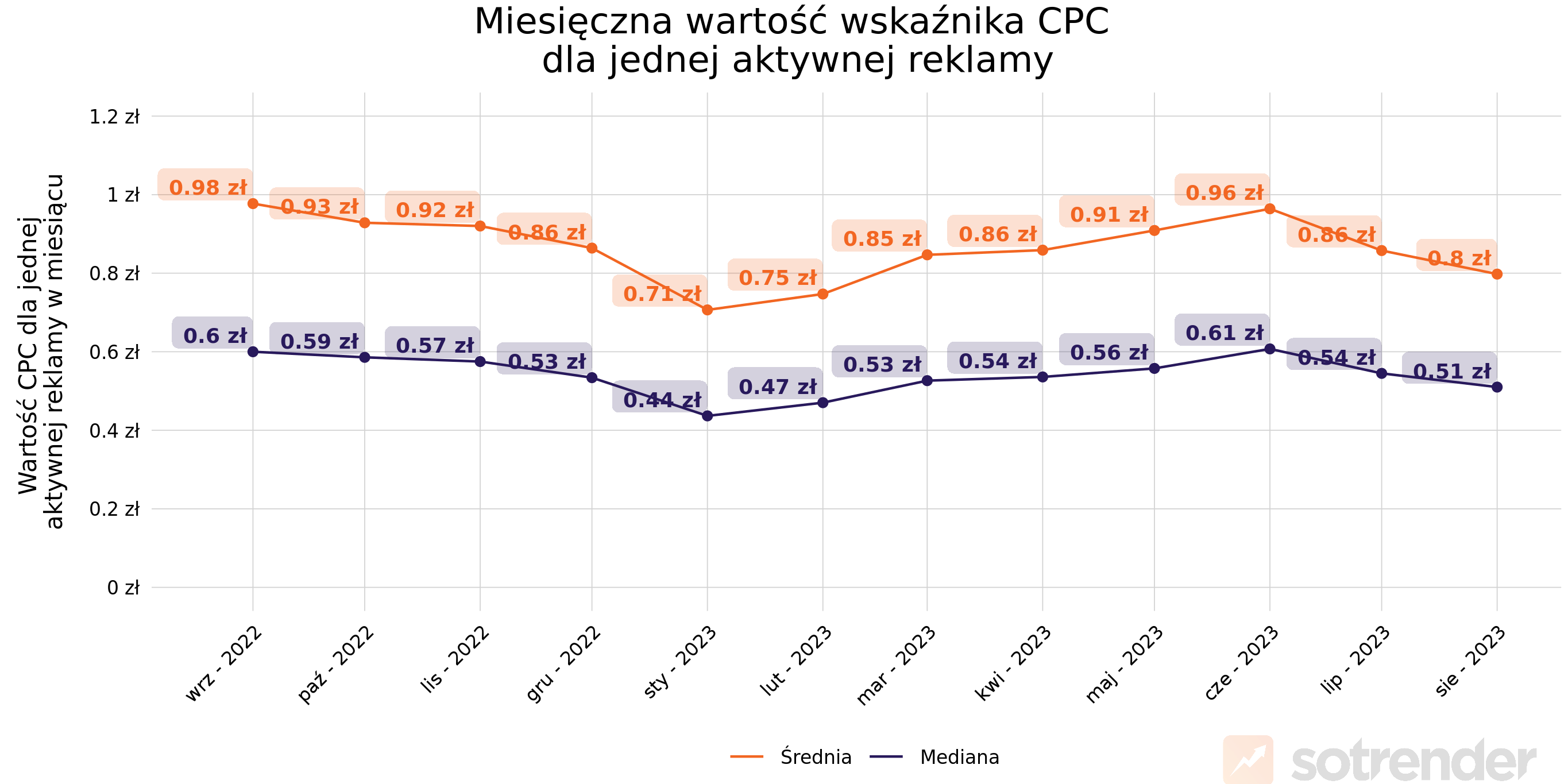 Z kolei średni CPC, jak i mediana, przyjmują znacznie mniejsze wahania.
