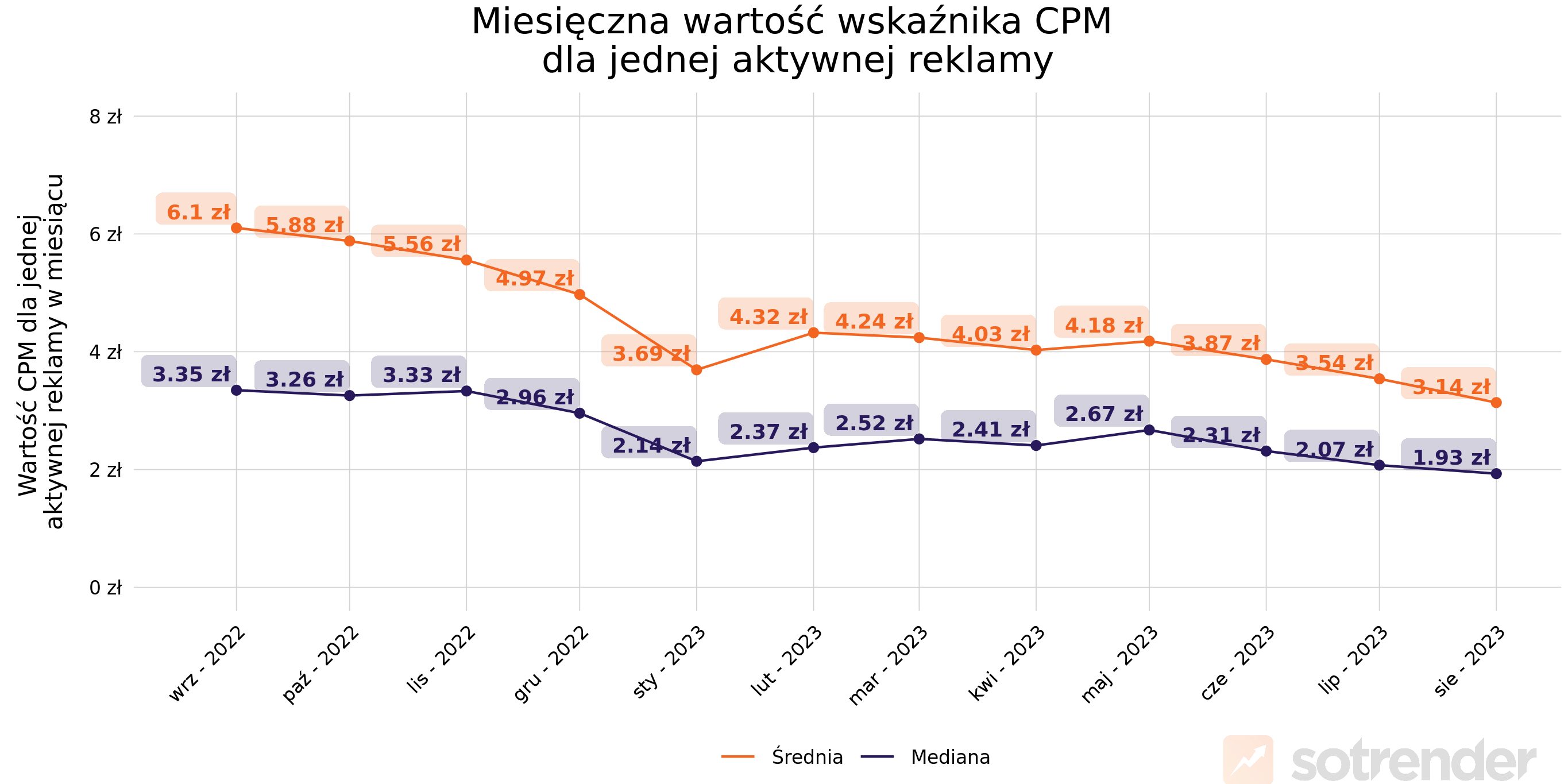 CPM jest także dalej w trendzie spadkowym – w porównaniu do września 2022 jest o niemalże połowę niższy. Na przestrzeni tego roku, średni CPM spadł z kolei o ponad 1zł.
