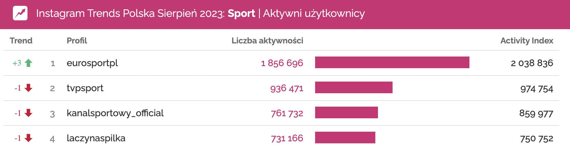 Profile o największej liczbie aktywności użytkowników w kategorii Media | Sport na Instagramie | sierpień 2023
