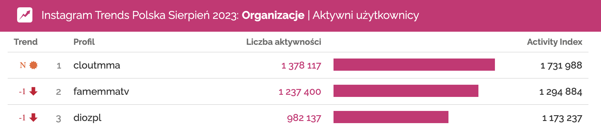 Profile o największej liczbie aktywności w kategorii Organizacje na Instagramie | sierpień 2023