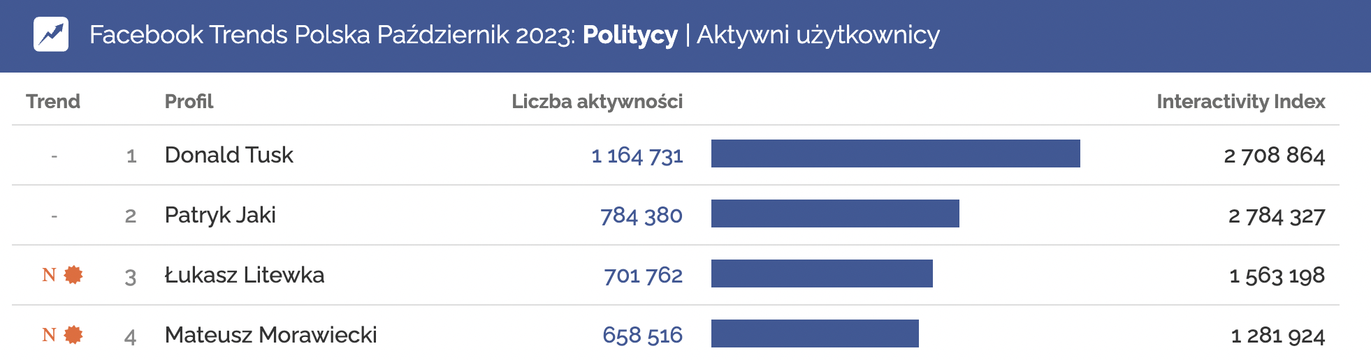 Liderem w rankingu pozostał Donald Tusk, wyprzedzając drugiego Patryka Jakiego o ponad 380 tys. aktywności użytkowników.