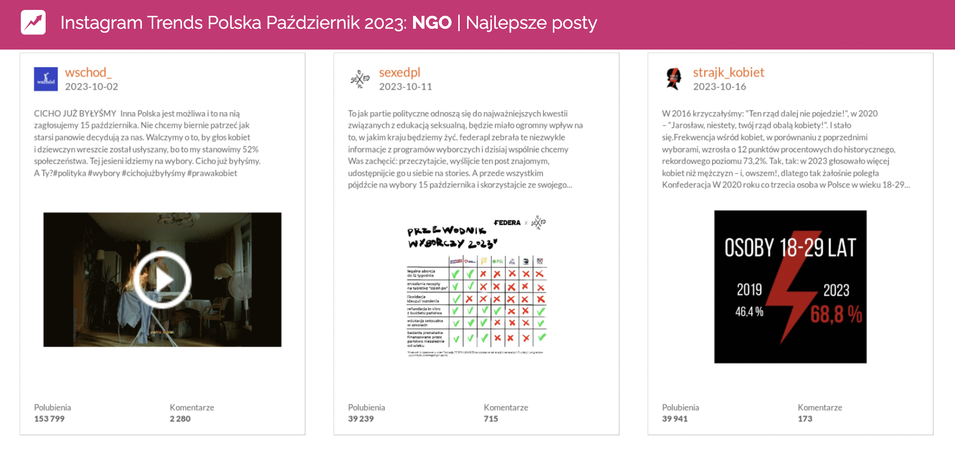 Najbardziej angażującym postem w kategorii NGO było wideo na profilu @wschod_. Materiał zatytułowany “Cicho już byłyśmy” jest zlepkiem wypowiedzi polityków, i kończy się przypomnieniem, że kobiety w Polsce stanowią 52% osób uprawnionych do głosowania.