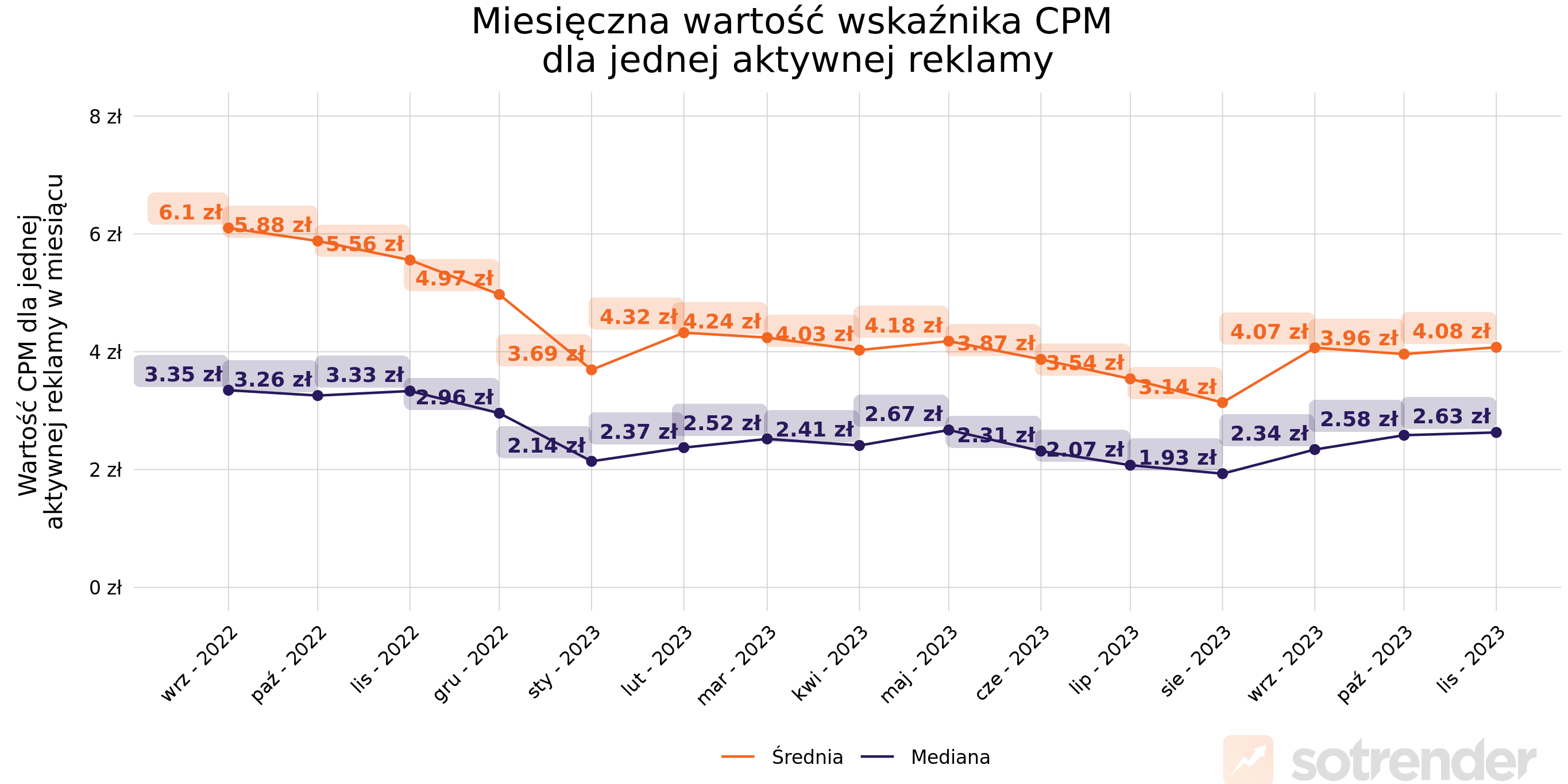 Mimo dużej konkurencji reklamodawców w okresie Black Friday, średni CPM wzrósł jedynie o 12 groszy (z 3 zł 96 gr do 4 zł 08 gr). Co ciekawe, rok temu za CPM reklamodawcy płacili aż o 1,5 zł więcej – w listopadzie 2022 średni CPM wynosił 5 zł 56 gr.