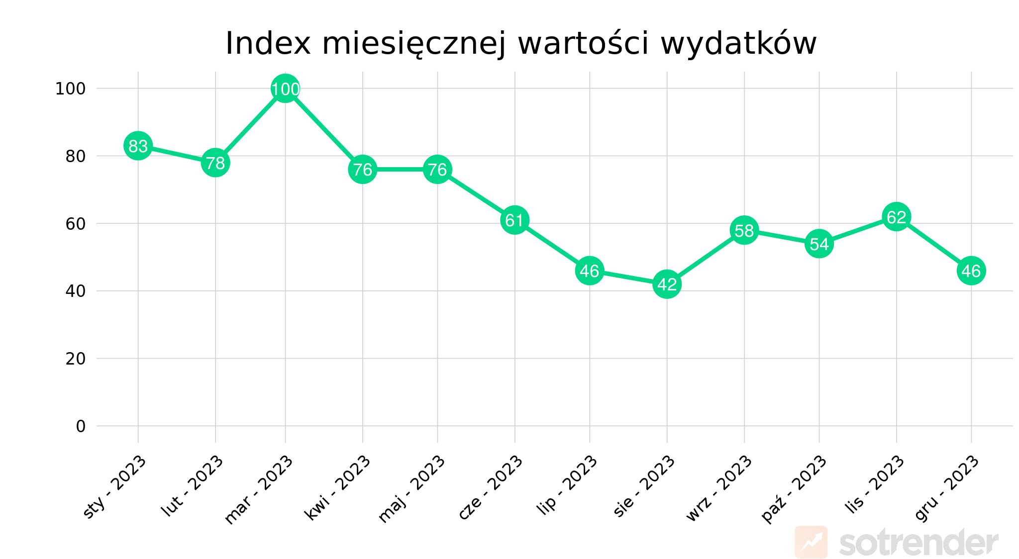 Analizując miesięczne wartości wydatków na przestrzeni całego minionego roku wygląda na to, że reklamodawcy najwięcej na reklamę wydawali w marcu 2023, a w grudniu wydawali o ponad połowę mniej. W minionym miesiącu wydatki kształtowały się na podobnym poziomie jak w lipcu i sierpniu.