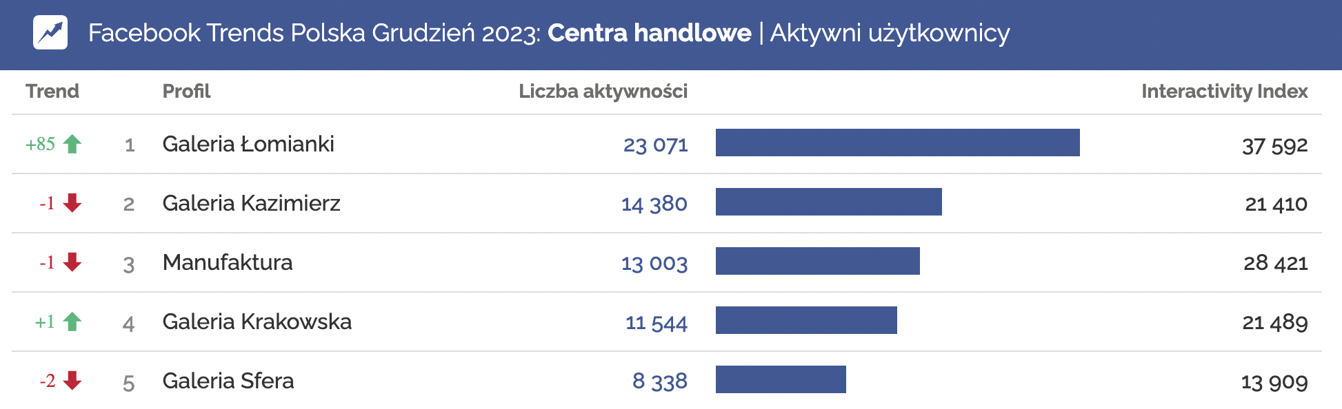 Profile o największej liczbie aktywności w kategorii Centra handlowe | Facebook grudzień 2023
