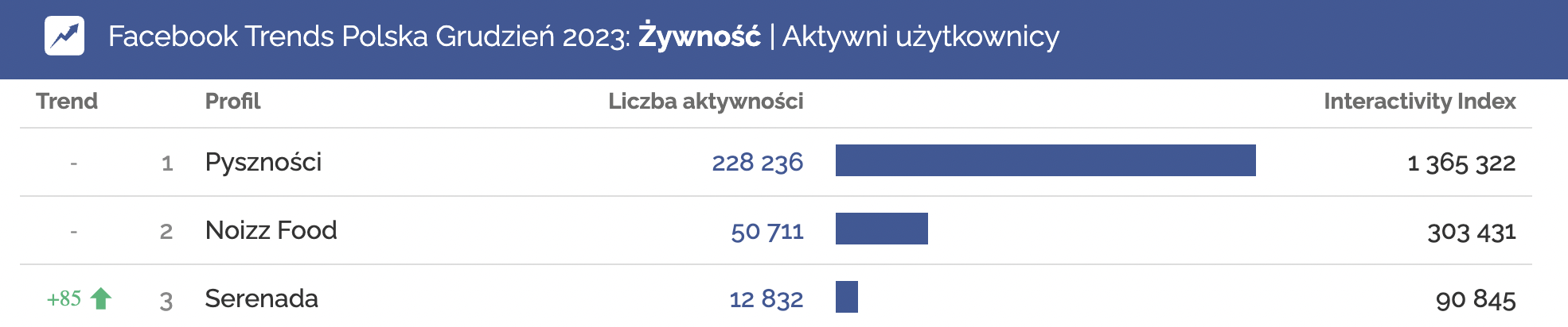 Pod względem łącznej liczby aktywności, profil Serenady awansował o 85 pozycji i uplasował się na wysokim trzecim miejscu w całej kategorii Żywność.