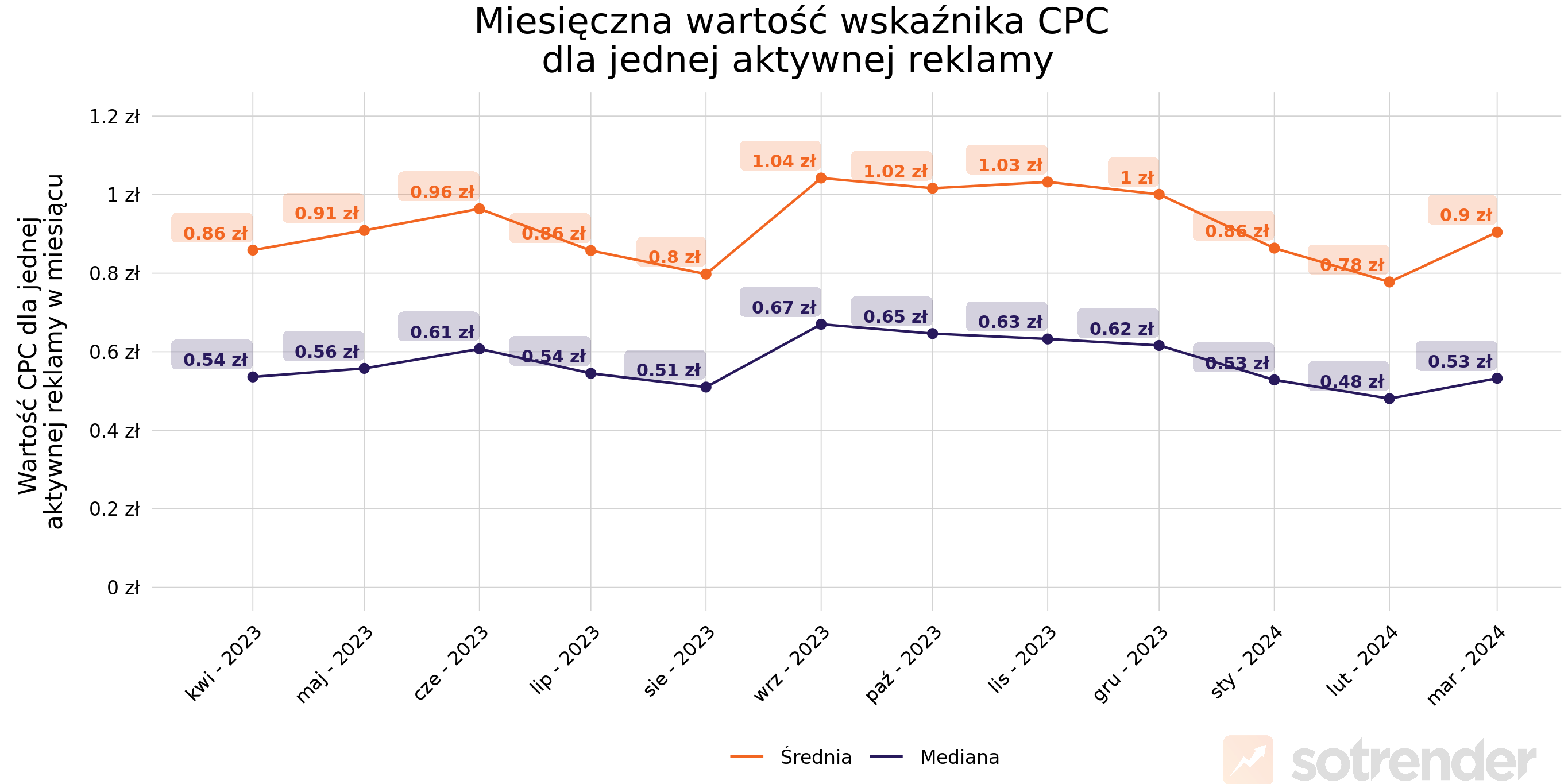 Średni CPC, który miesiąc temu osiagnął najniższą wartość na przestrzeni ostatnich dwunastu miesięcy, w marcu wzrósł o 12 groszy i osiągnął wartość 90 groszy.