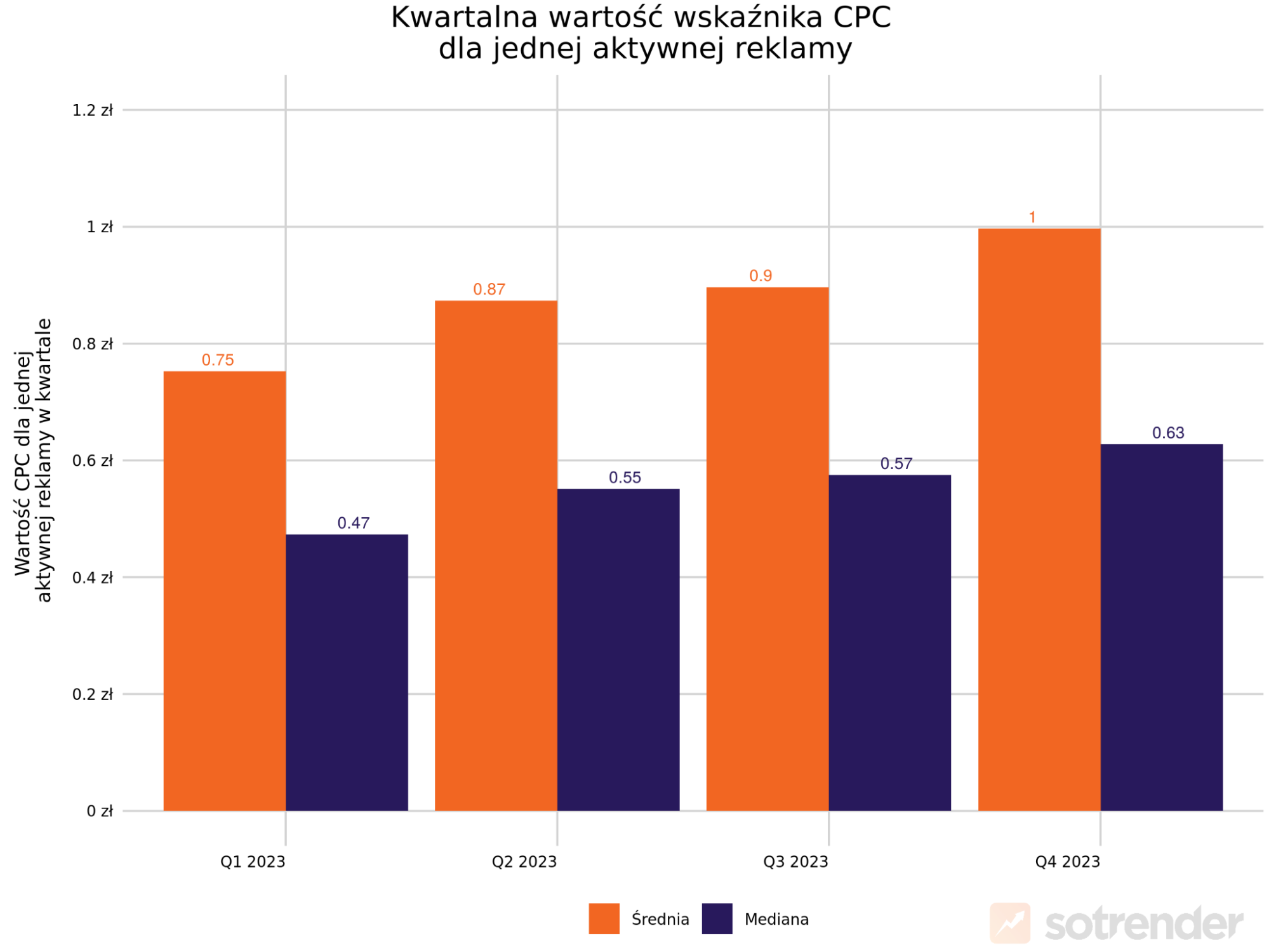 Do tego dochodzą rosnące jednostkowe koszty za kliknięcie czy dotarcie do tysiąca użytkowników. Według naszych analiz, tylko na przestrzeni 2023 roku, koszt średniego CPC w ekosystemie Meta wzrósł o 32,5%.