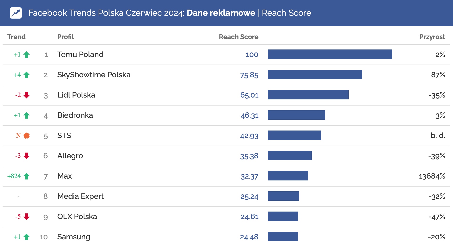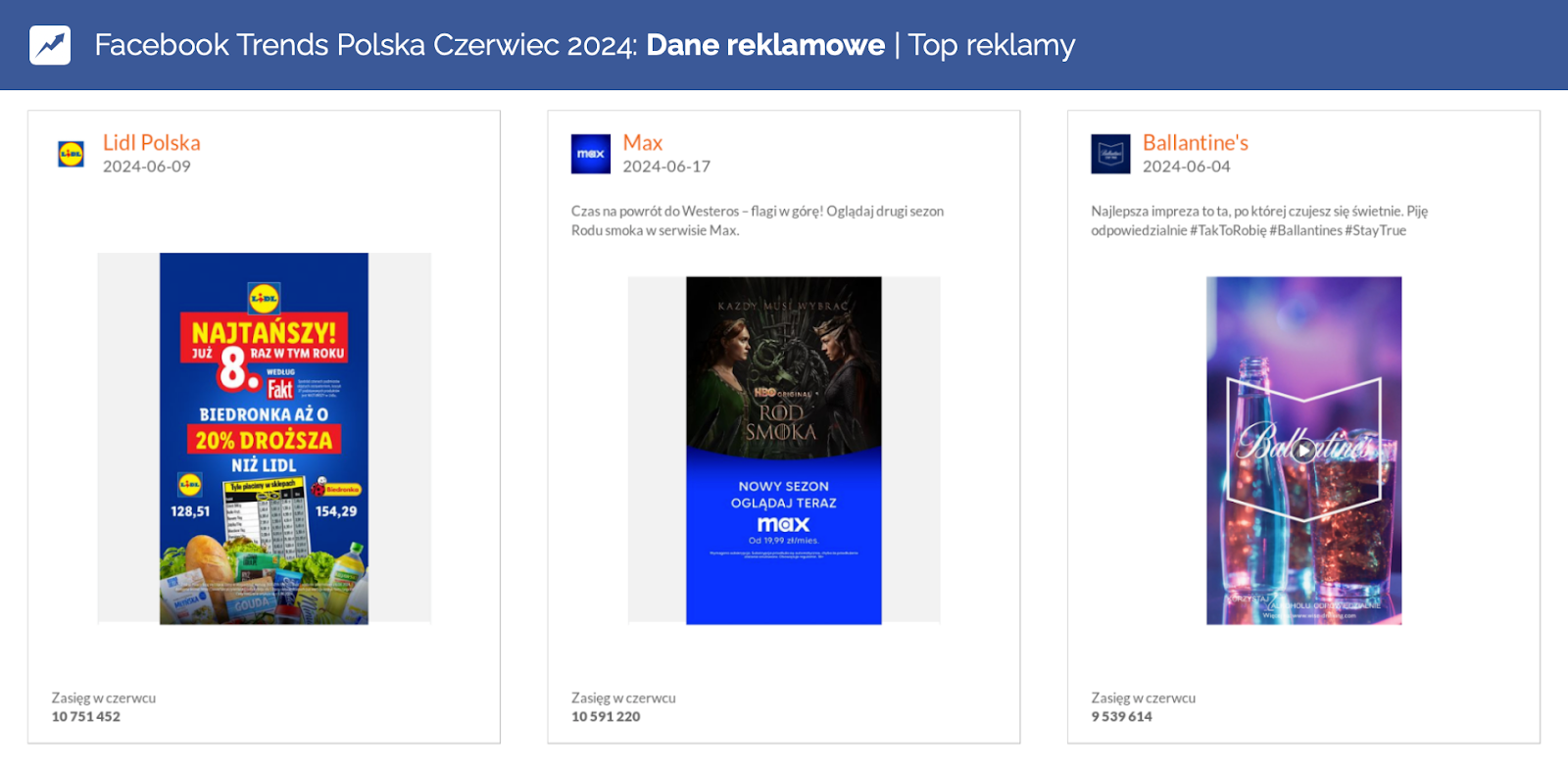Pozostając w temacie walki o koronę, na podium wskoczyła także platforma Max z reklamą drugiego sezonu „Rodu smoka”. Kampania promująca serial sprawiła, że serwis streamingowy osiągnął w tym miesiącu imponujący wzrost Reach Score aż o 13684%. Tym samym Max znalazł się wśród 7 reklamodawców o największych zasięgach na polskim Facebooku.