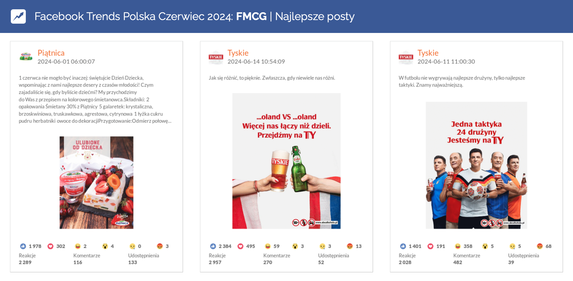 W tym miesiącu Facebook wypełniony był sportowymi tematami. Tyskie regularnie publikowało posty związane z meczami Euro 2024, z których dwa znalazły się w zestawieniu najlepszych postów wśród marek FMCG.