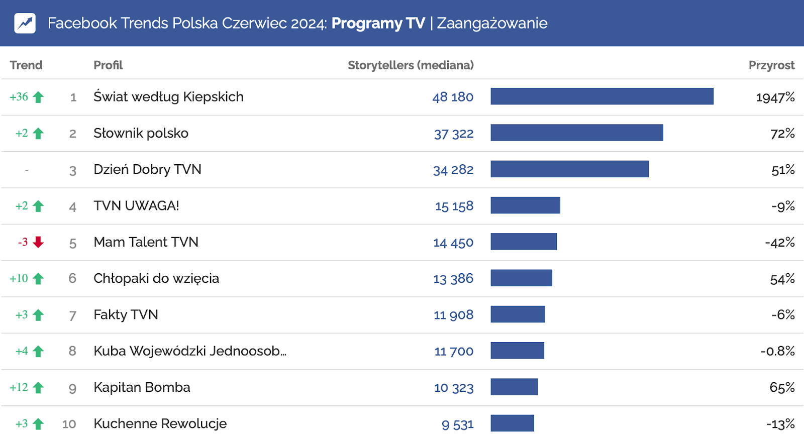 W rezultacie Świat według Kiepskich znalazł się na pierwszym miejscu w rankingu zaangażowania, awansując o 36 pozycji z przyrostem aż o 1947%. Profil wskoczył również na 3. miejsce w zestawieniu aktywności użytkowników, notując awans o 35 miejsc.
