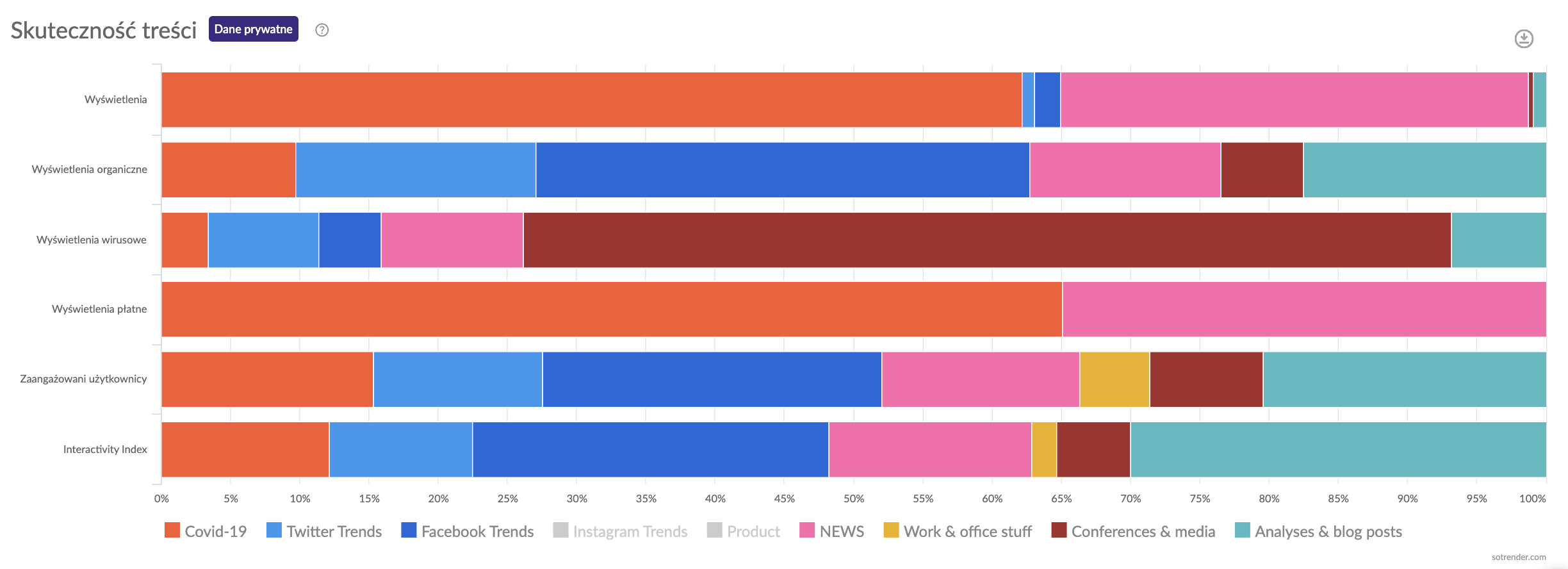 Patrząc na przykład powyżej widać, że najwięcej wyświetleń (jednak głównie płatnych wyświetleń) miały treści dotyczące COVID-19, z kolei największe zaangażowanie miały treści z kategorii Facebook Trends i innych analiz.