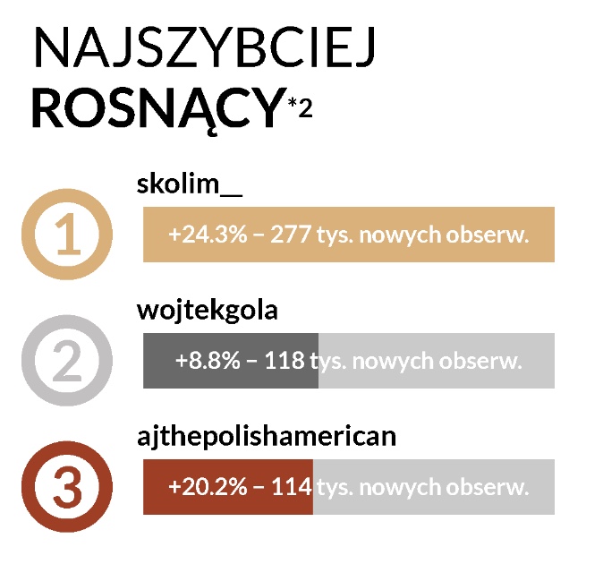W tym miesiącu najwięcej działo się w kategorii Osoby. Wojtek Gola zanotował spektakularny wzrost o 1119 pozycji, osiągając 4. miejsce w rankingu zaangażowania i zdobył tytuł drugiego najszybciej rosnącego profilu miesiąca z 118 tys. nowych obserwujących.