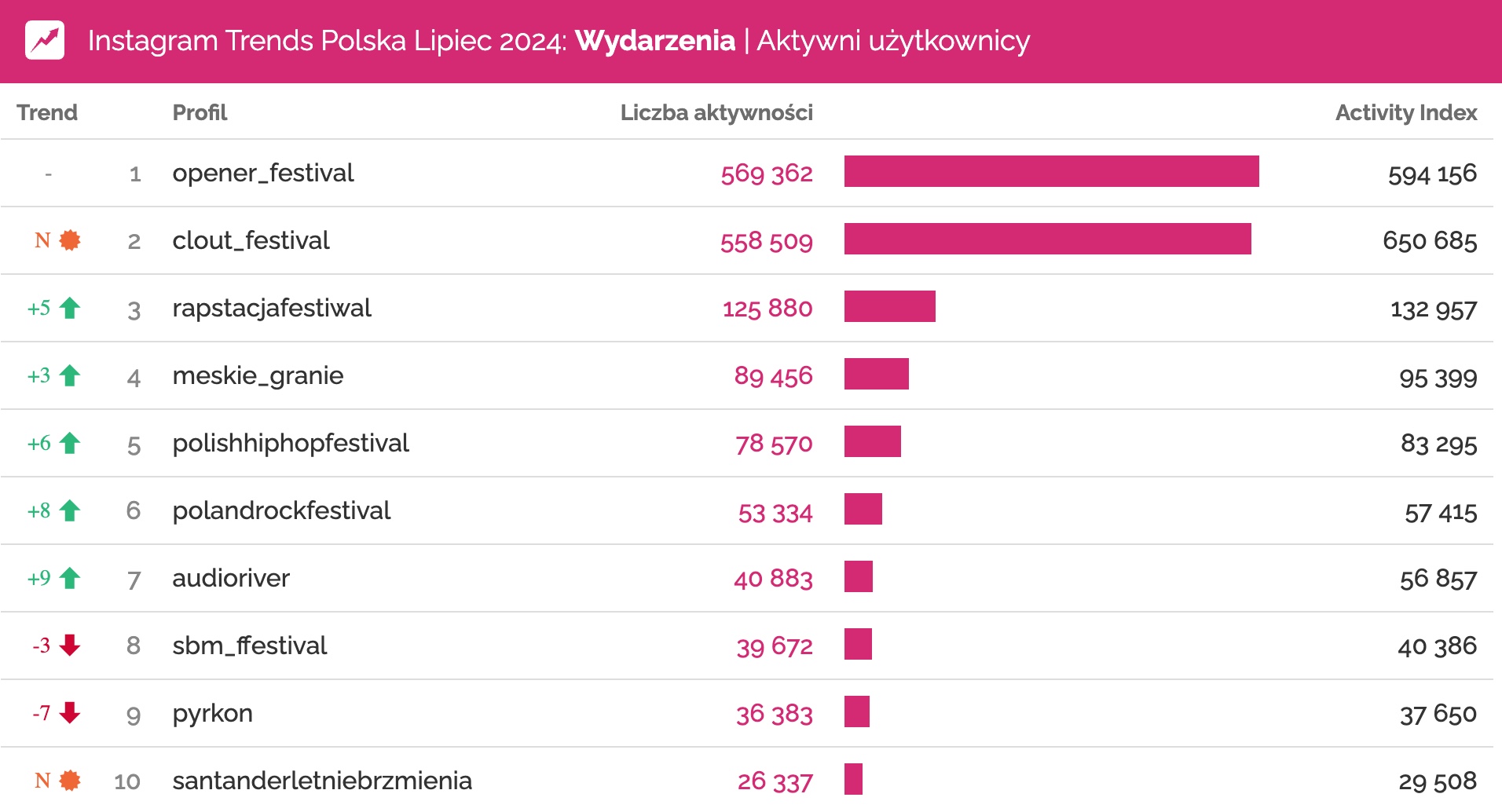 Clout Festival zadebiutował na 4. miejscu wśród największych profili w kategorii Wydarzenia. Zajął też 2. miejsce w rankingu zaangażowania, zgarniając tytuł profilu, na którym użytkownicy byli najbardziej aktywni (i pokonując tym samym Open’er Festival). Aż sześć postów festiwalu znalazło się w zestawieniu najlepszych w miesiącu.