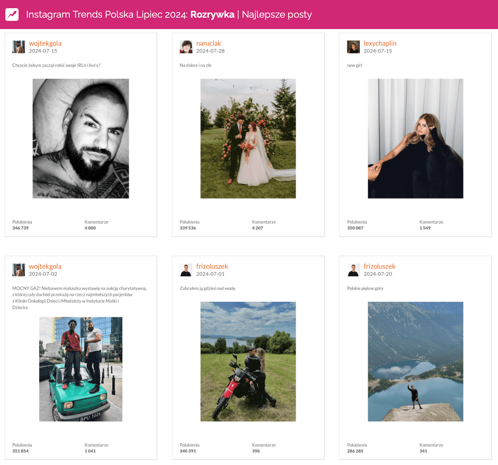 Panowie dominowali także w kategorii Rozrywka. W zestawieniu profili o największej aktywności użytkowników Wojtek Gola wskoczył na sam szczyt, awansując o 88 pozycji.