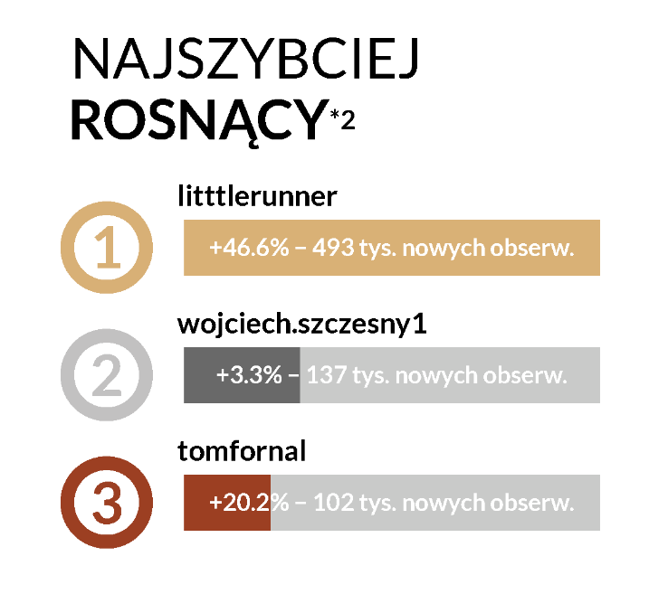 W czołówce znalazł się również Tomasz Fornal, który po zdobyciu srebrnego medalu na Olimpiadzie przyciągnął 102 tysiące nowych obserwujących, co ulokowało go na 3. miejscu wśród najszybciej rosnących profili sierpnia.