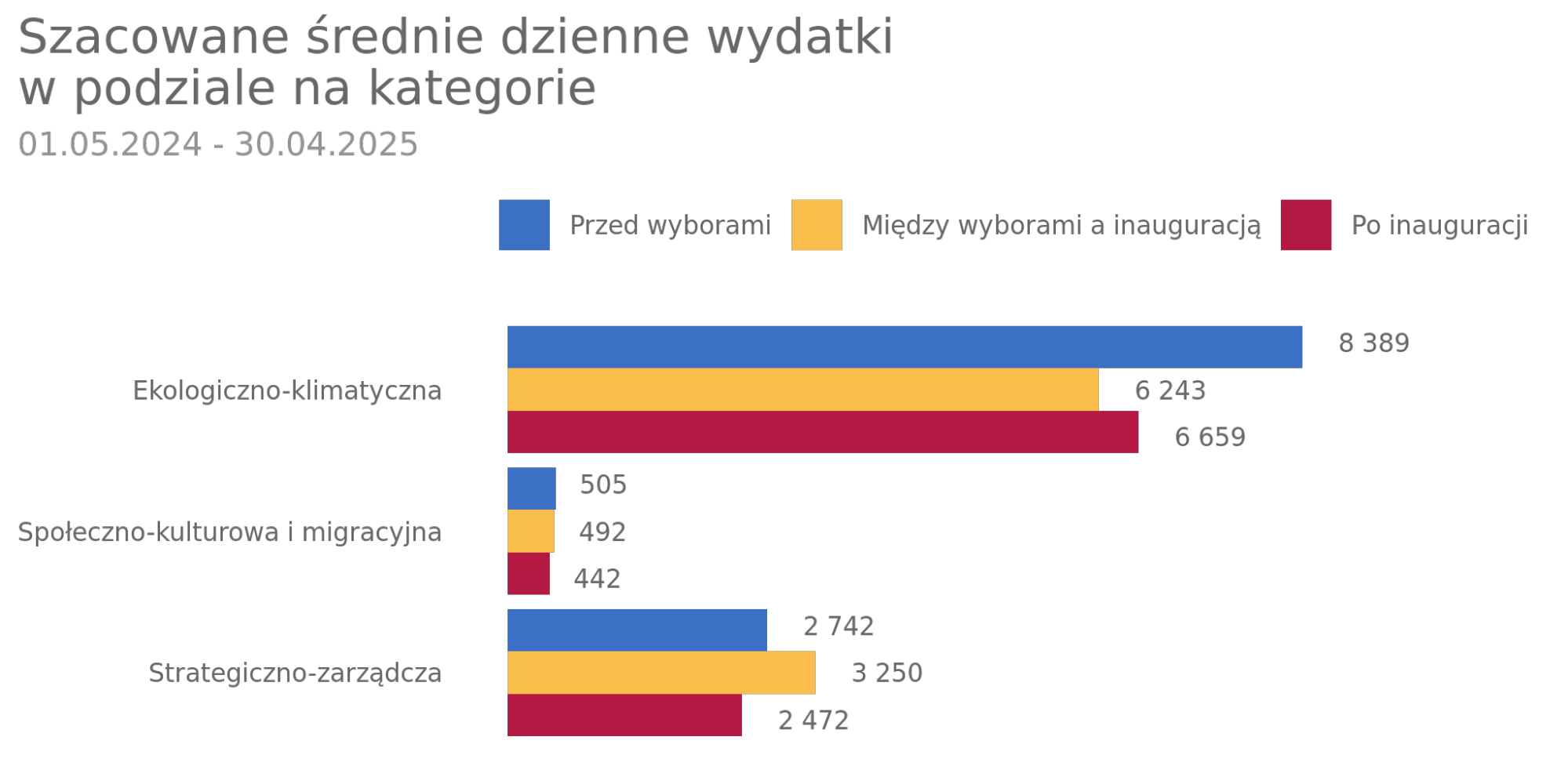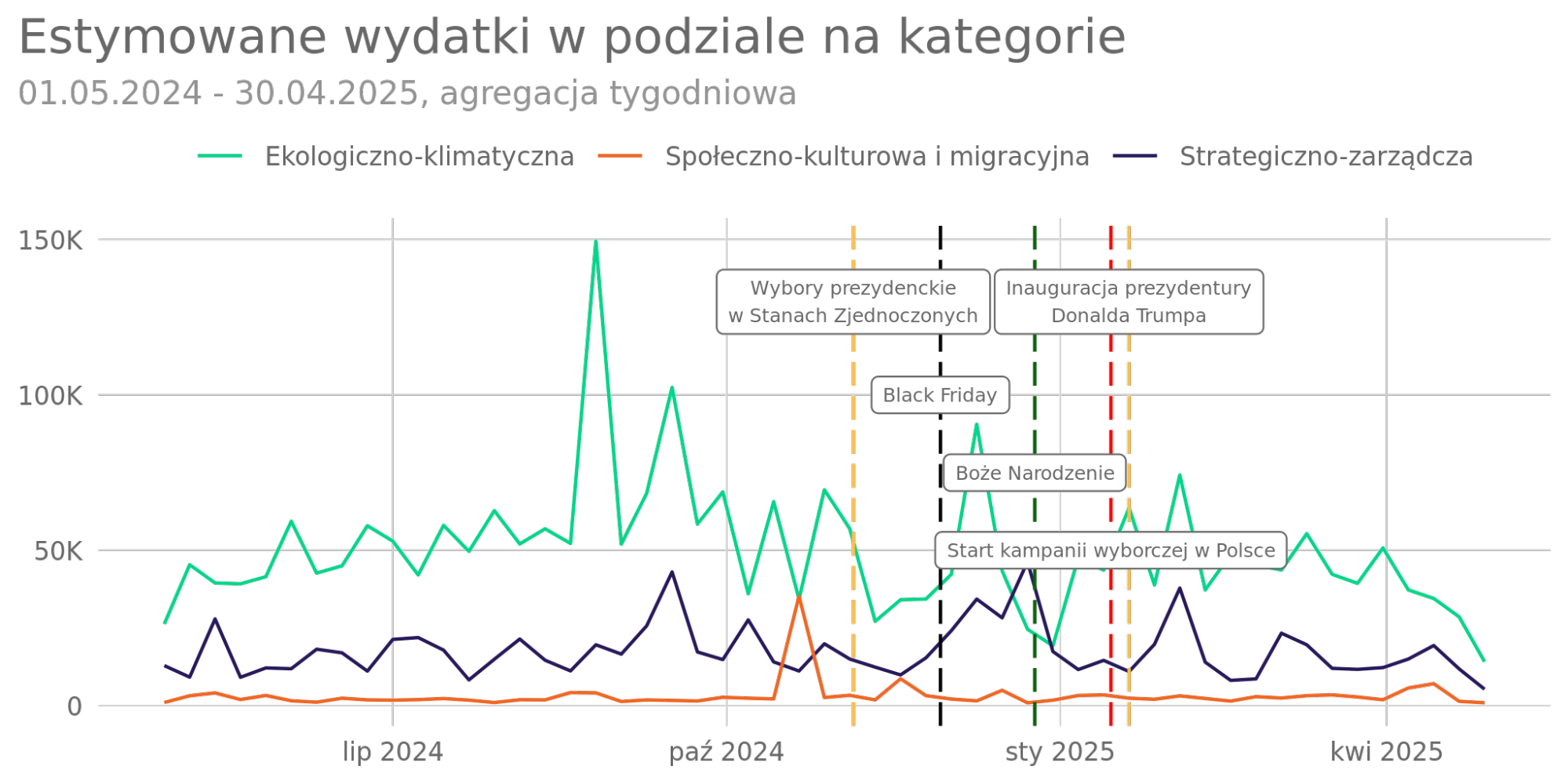 Nieco większe zmiany można dostrzec patrząc na wydatki reklamowe – tu różnice nie są takie duże. Co ciekawe, w przypadku reklam z kategorii strategiczno-zarządczych nieco więcej budżetów wydawano między wyborami a inauguracją nowego prezydenta. Bardziej wyrównały się również wydatki na reklamy dotyczące kwestii ekologiczno-klimatycznych.