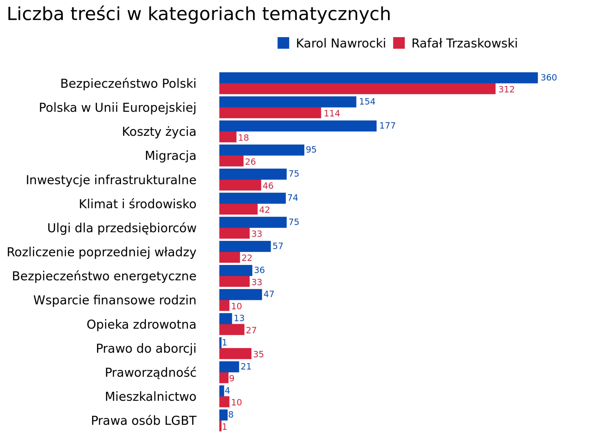 Reklam dotyczących klimatu i środowiska niemal dwa razy więcej wymitował Karol Nawrocki (74 vs 42 Rafał Trzaskowski), jednak część z nich dotyczyła m.in. odrzucenia Zielonego Ładu, czyli nie do końca kwestii proekologicznych.