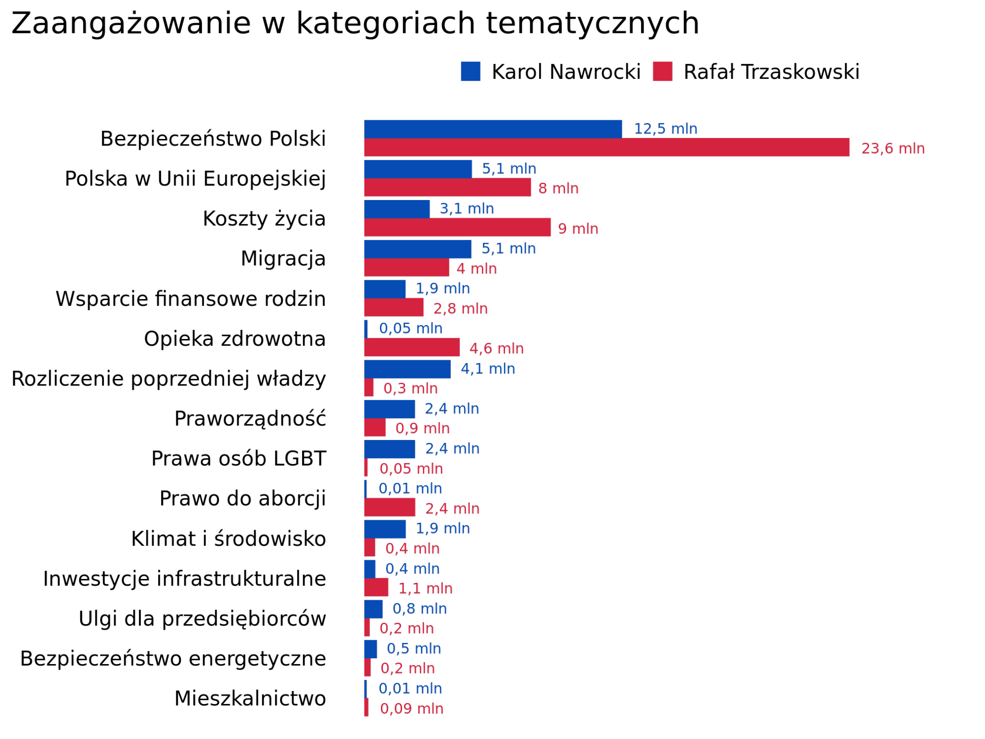 W rankingu zaangażowania różnice są jeszcze bardziej widoczne. Treści dotyczące klimatu i środowiska były mało interesujące i angażujące wyborców, choć ponownie więcej wyborców Karola Nawrockiego wchodziło z nimi w interakcje. Widać tu ponownie raczej odwrót od części inicjatyw uznawanych za proekologiczne (np. Zielonego Ładu).