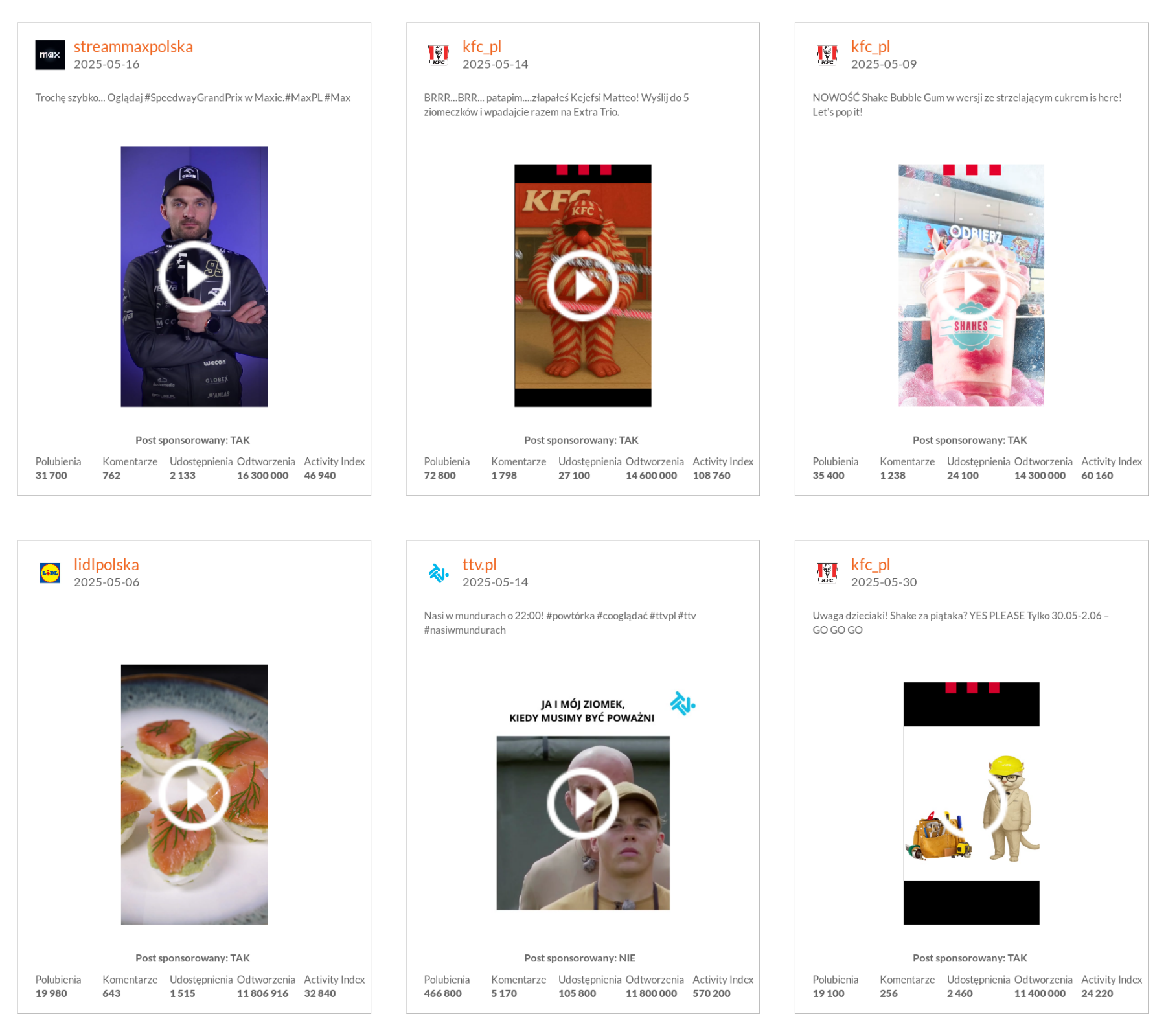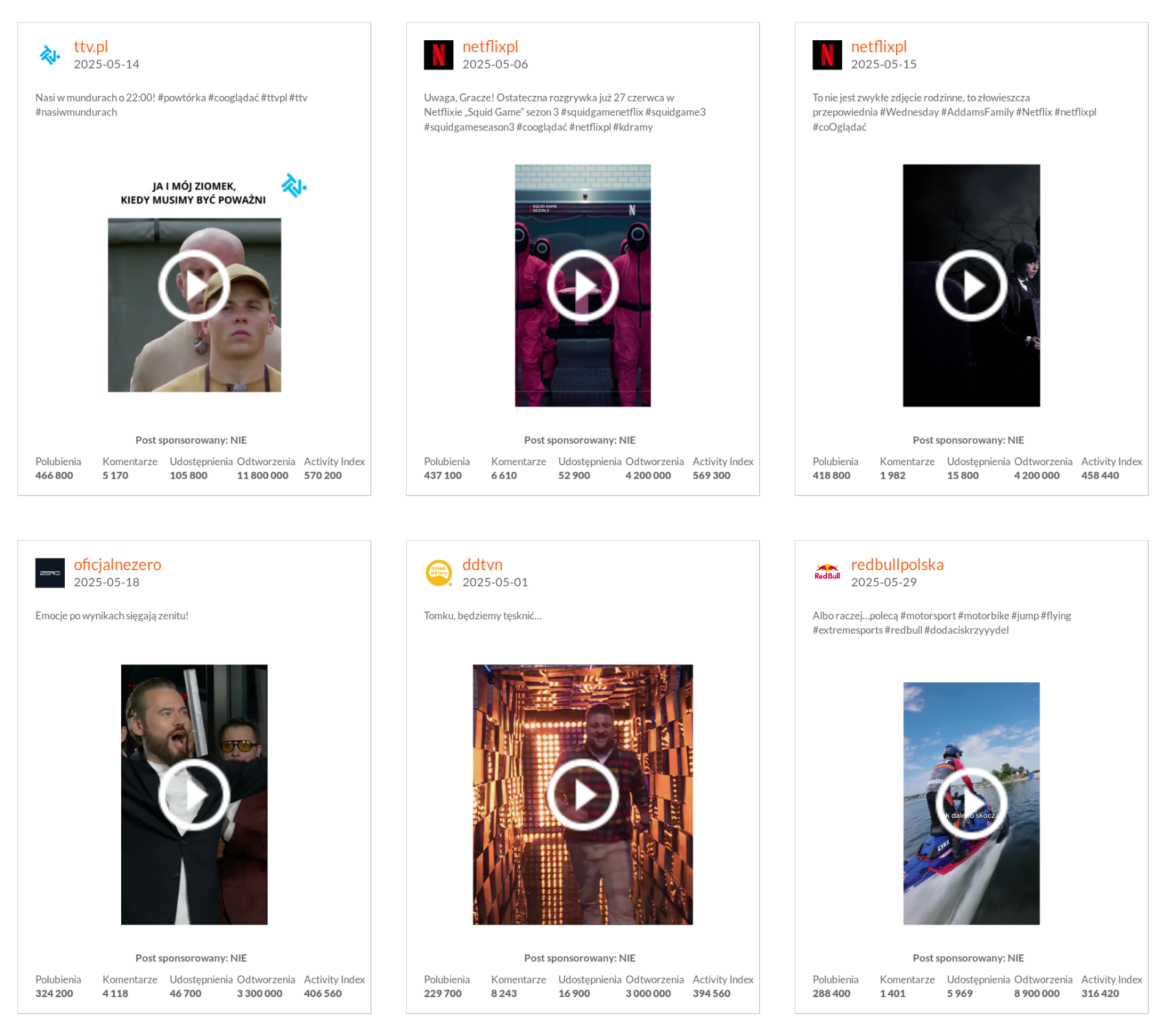 Pod względem Activity Index najlepszym materiałem okazał się film opublikowany przez @ttv.pl. Na podium znalazły się również dwa posty z profilu Netflix Polska.
