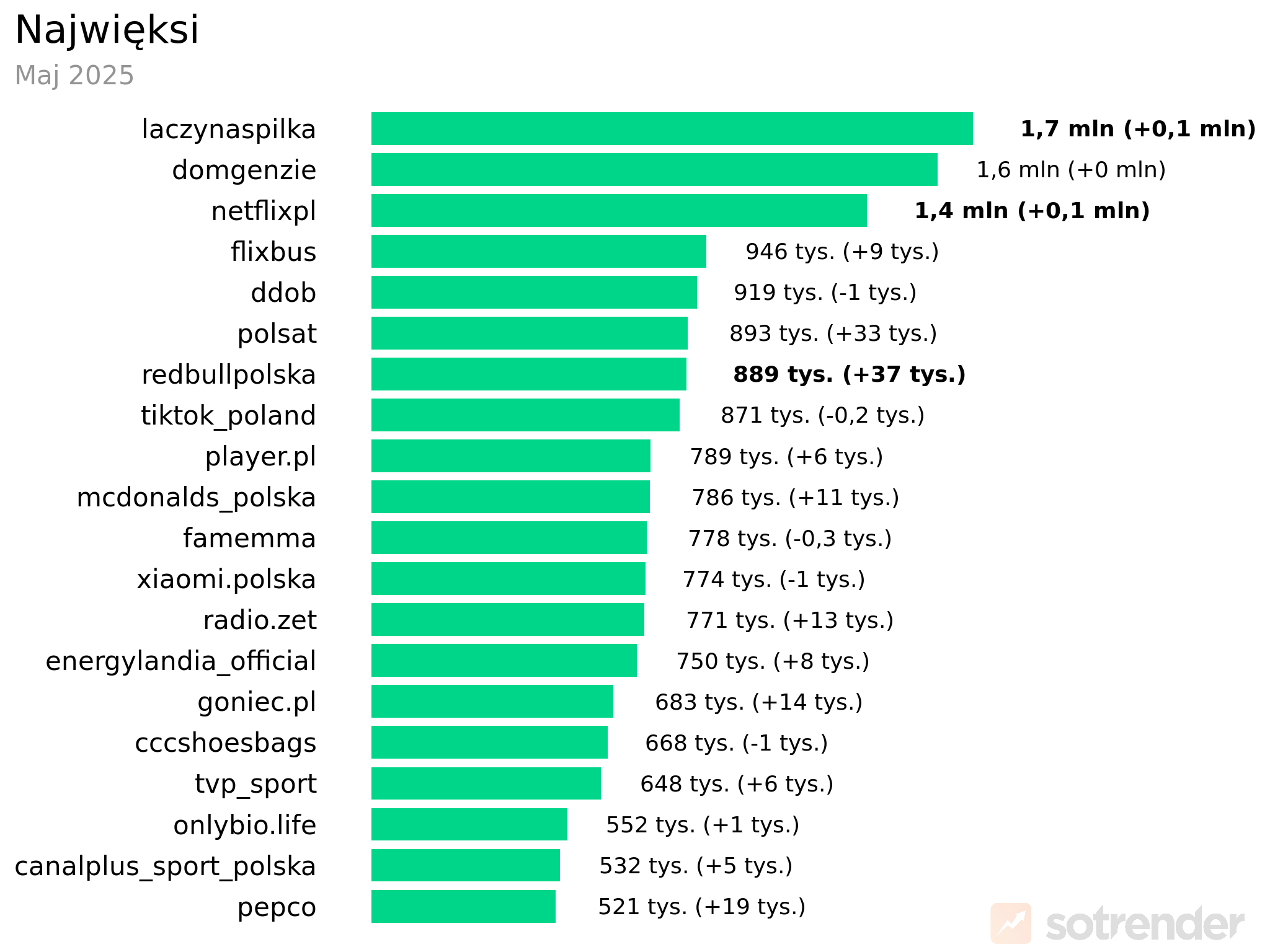 Profil @laczynaspilka zwiększył liczbę obserwujących o 100 tys. i umocnił się na pierwszej pozycji. @domgenzie nie zanotował wzrostu, ale i tak zachował drugą lokatę. @netflixpl nadrabia straty do lidera – przyciągnął w maju aż 100 tys. nowych obserwujących.